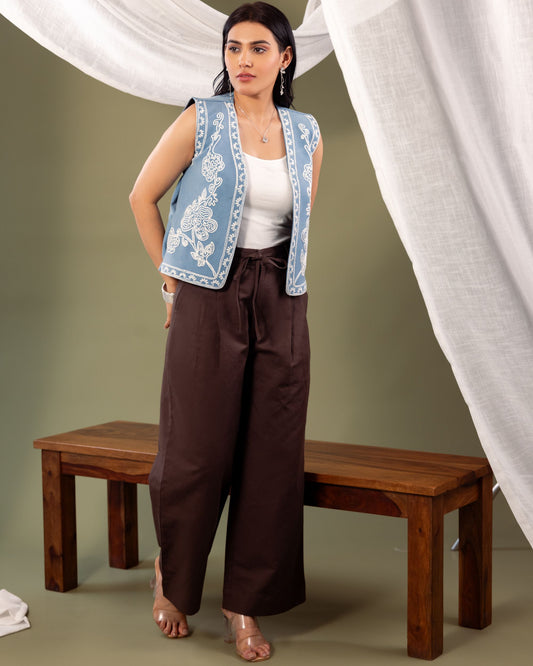 Women’s Denim Sleeveless Jacket with Dori Embroidery – Stylish Layering Vest by Panchakanya