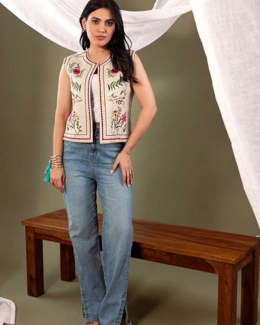 Women’s Denim Aladdin Jacket with Embroidery – Ethnic Fusion Sleeveless Vest by Panchakanya