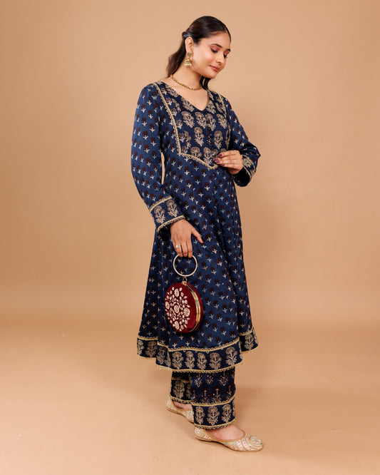 Navy Blue Modal Embroidered Ajrak Print Kurta with Pants – Panchakanya Clothing
