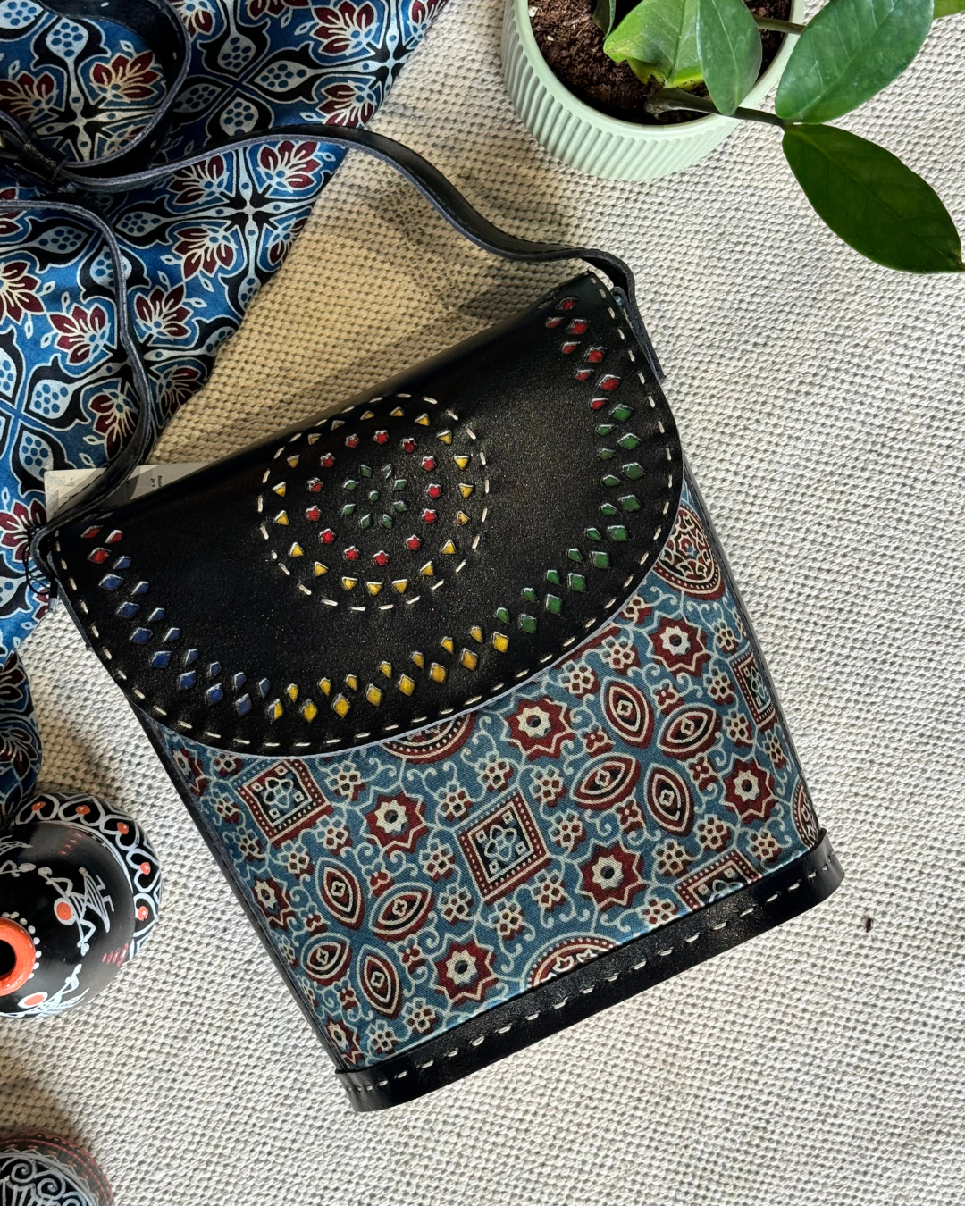 Authentic Gujarati Leather Bag – Hut Shape Handbag with Traditional Kutch Print