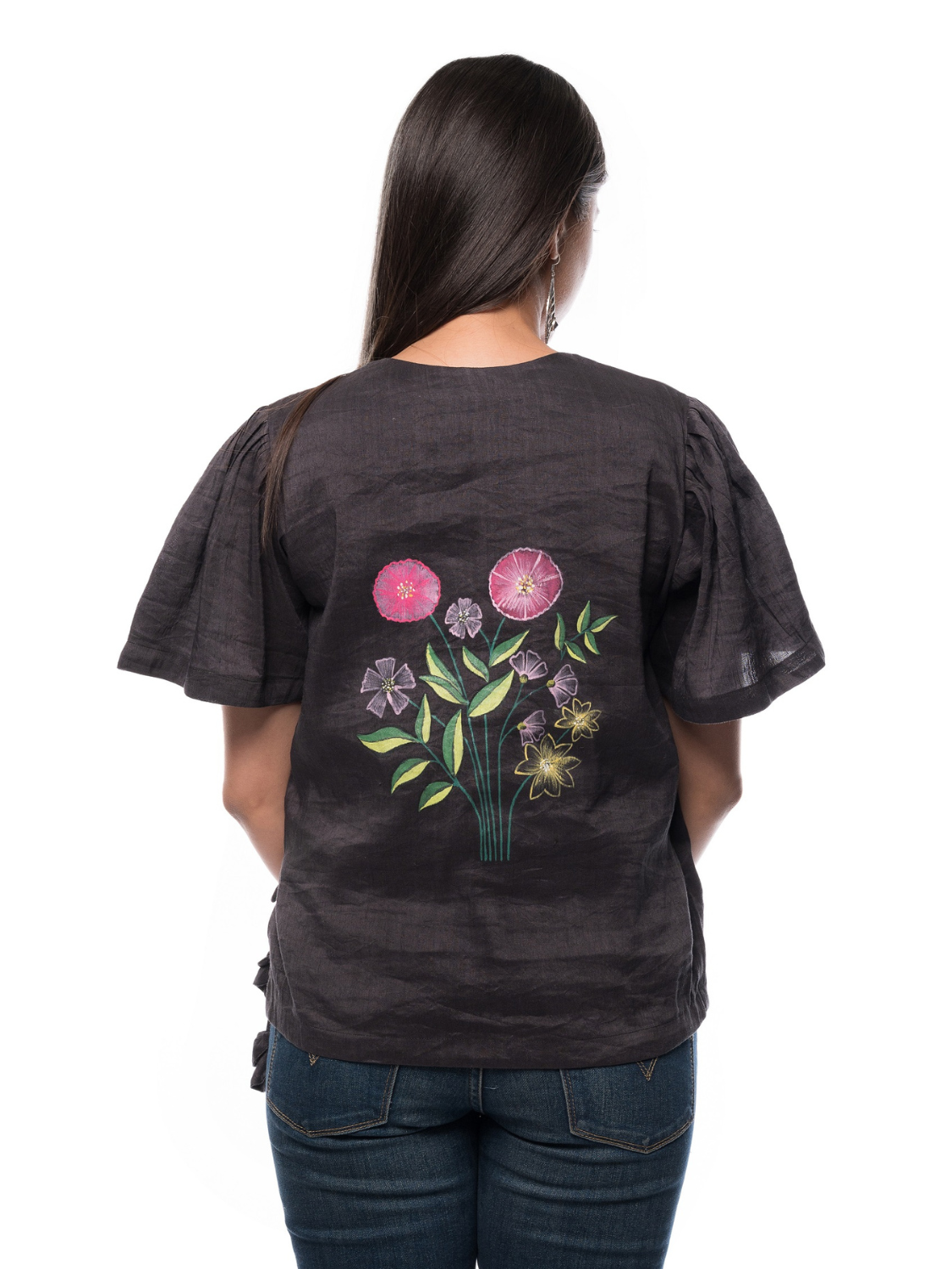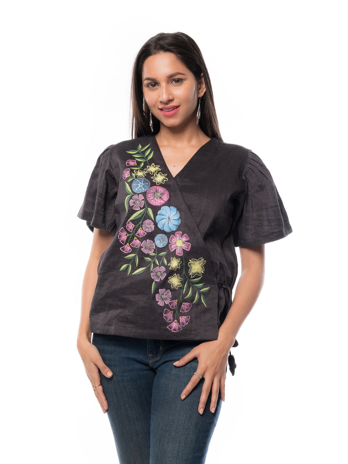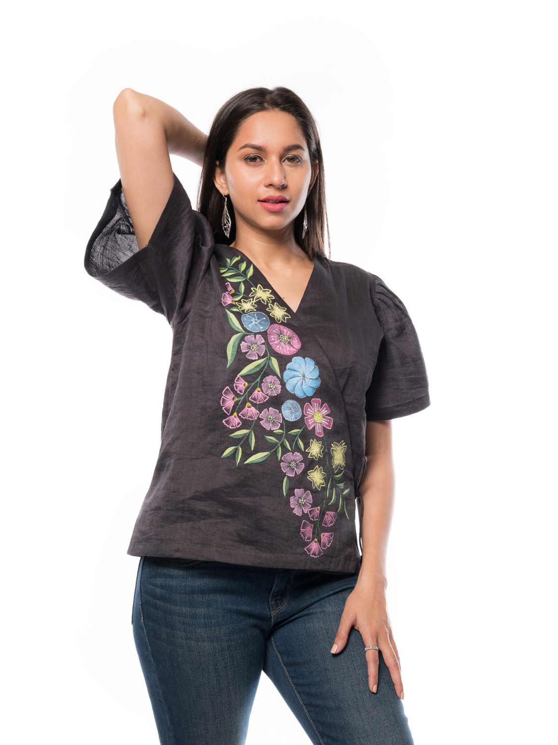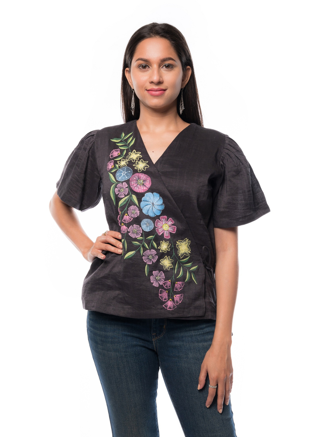 Black Angrakha Pattern Overlapping V-Neck Top Half Sleeve For Women's Girls & Ladies