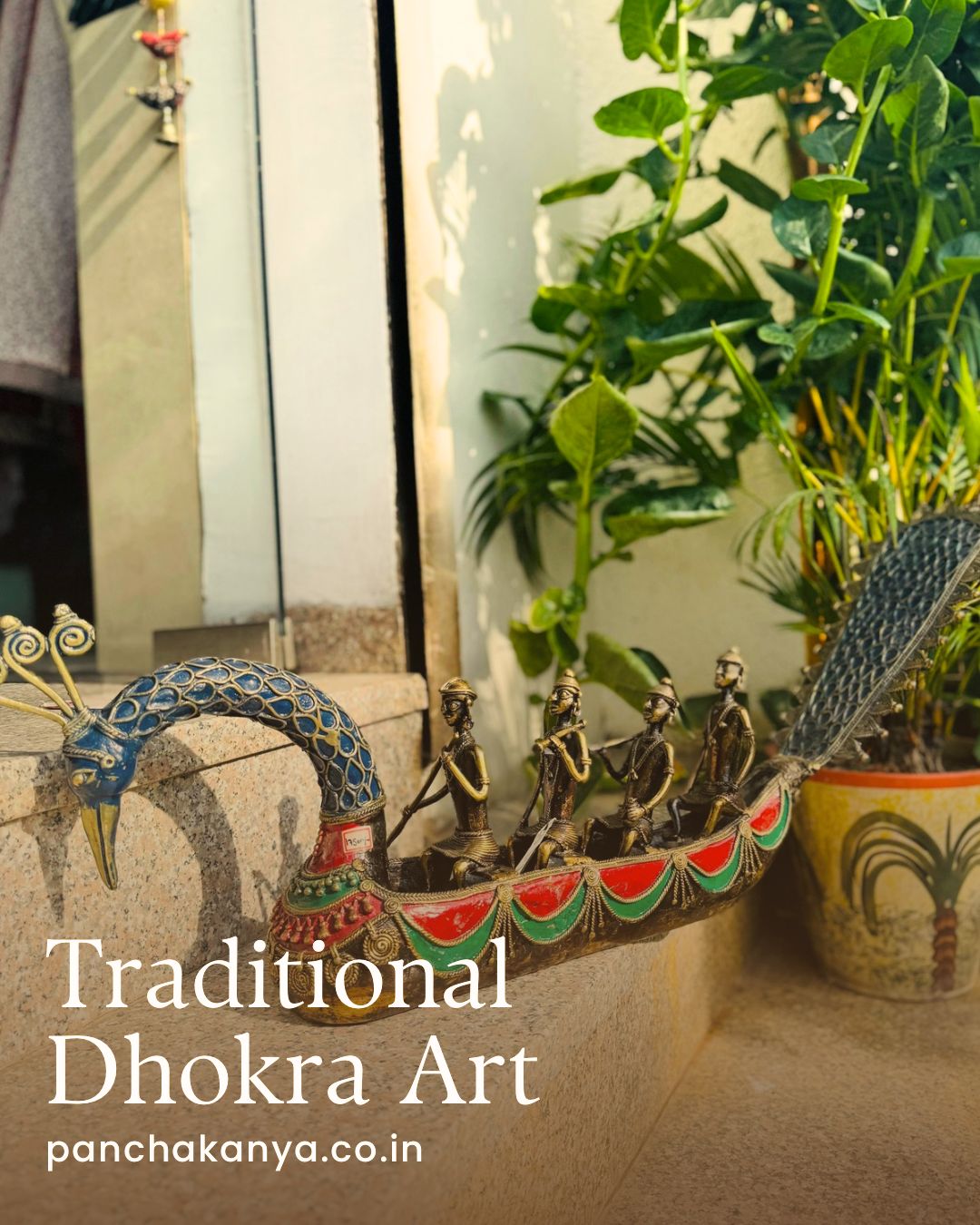 Exquisite Dhokra art Peacock Four Men Boat, handcrafted by Indian artisans, ideal for adding a traditional, antique charm to your decor.