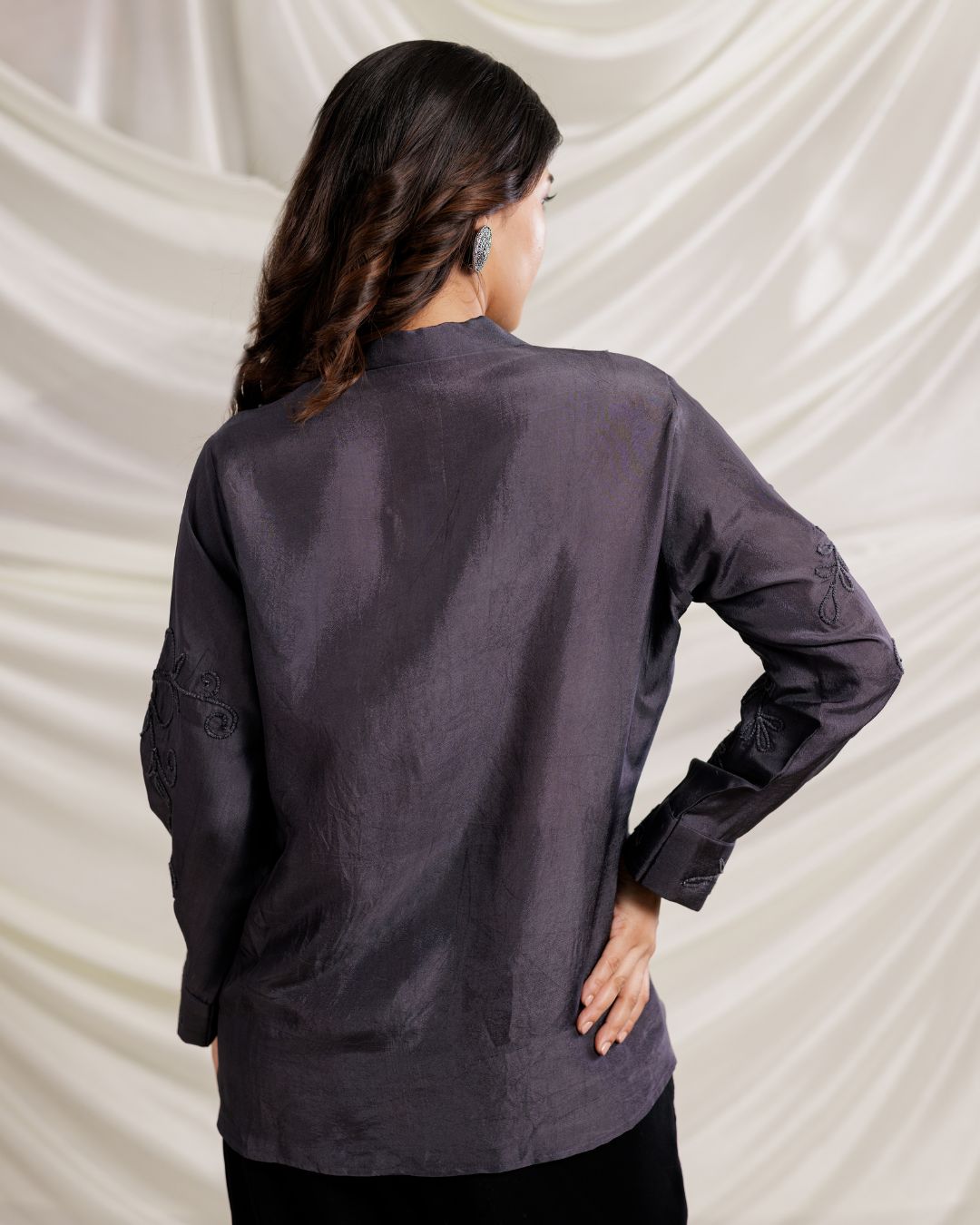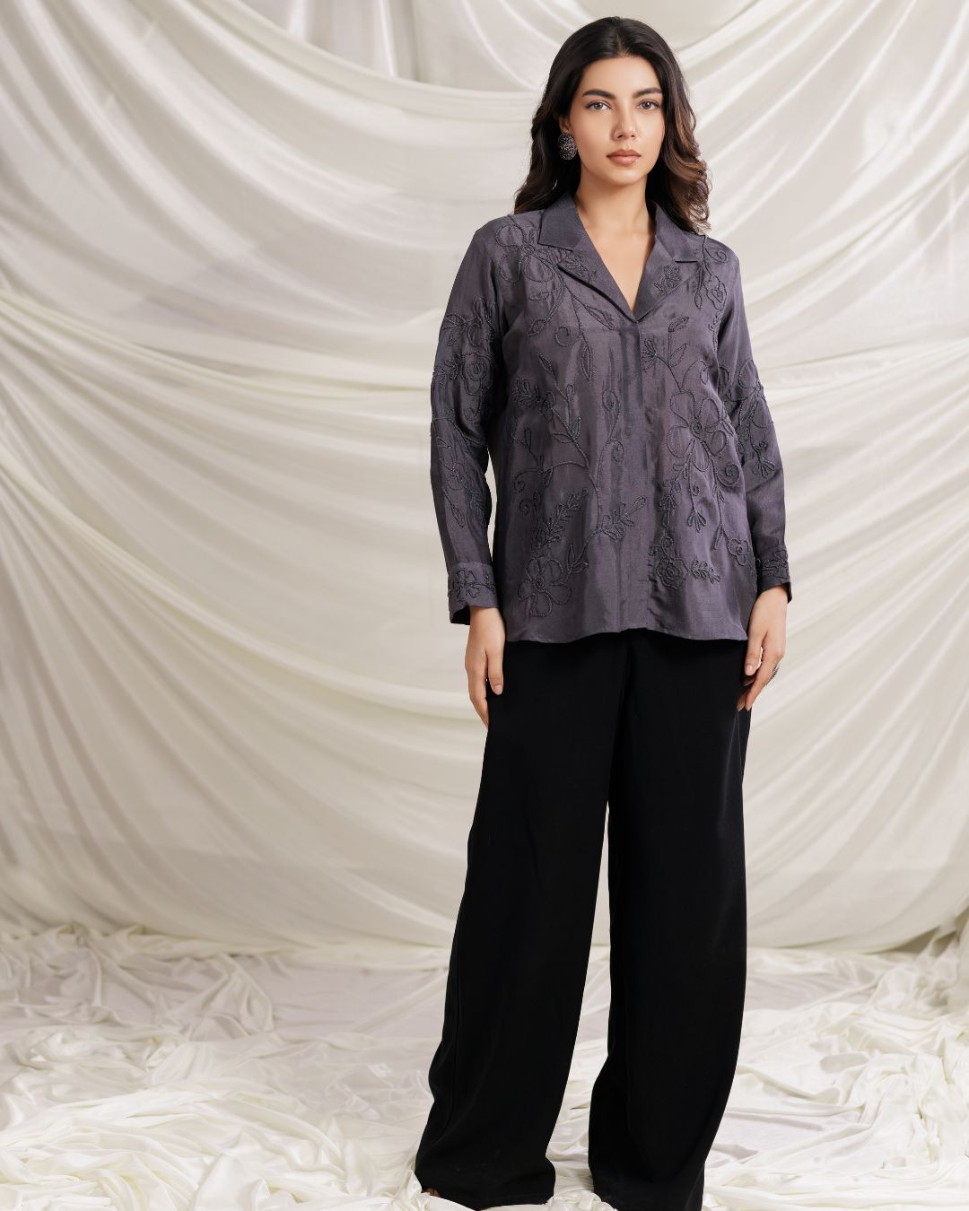 Elevate your everyday elegance with our Charcoal Grey Embroidered Shirt, designed for the modern woman who values style and sophistication. Featuring intricate floral embroidery on a rich charcoal base, this long-sleeved blouse exudes quiet luxury and timeless charm. The relaxed fit ensures all-day comfort without compromising on style, making it a versatile wardrobe essential.