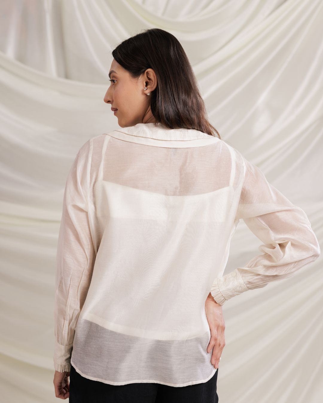 The unique double collar design adds a contemporary edge to this otherwise classic piece, while the full sleeves with ruffled cuffs enhance its sophistication. Whether paired with tailored trousers for a polished work look or layered over ethnic bottoms for festive flair, this versatile blouse transitions seamlessly from day to evening wear.