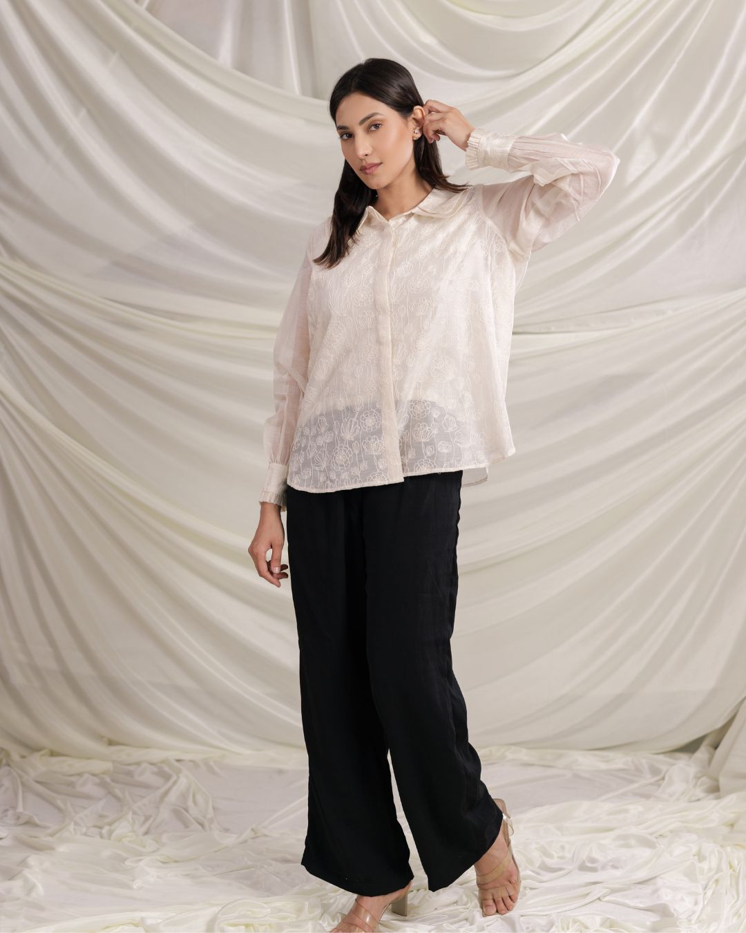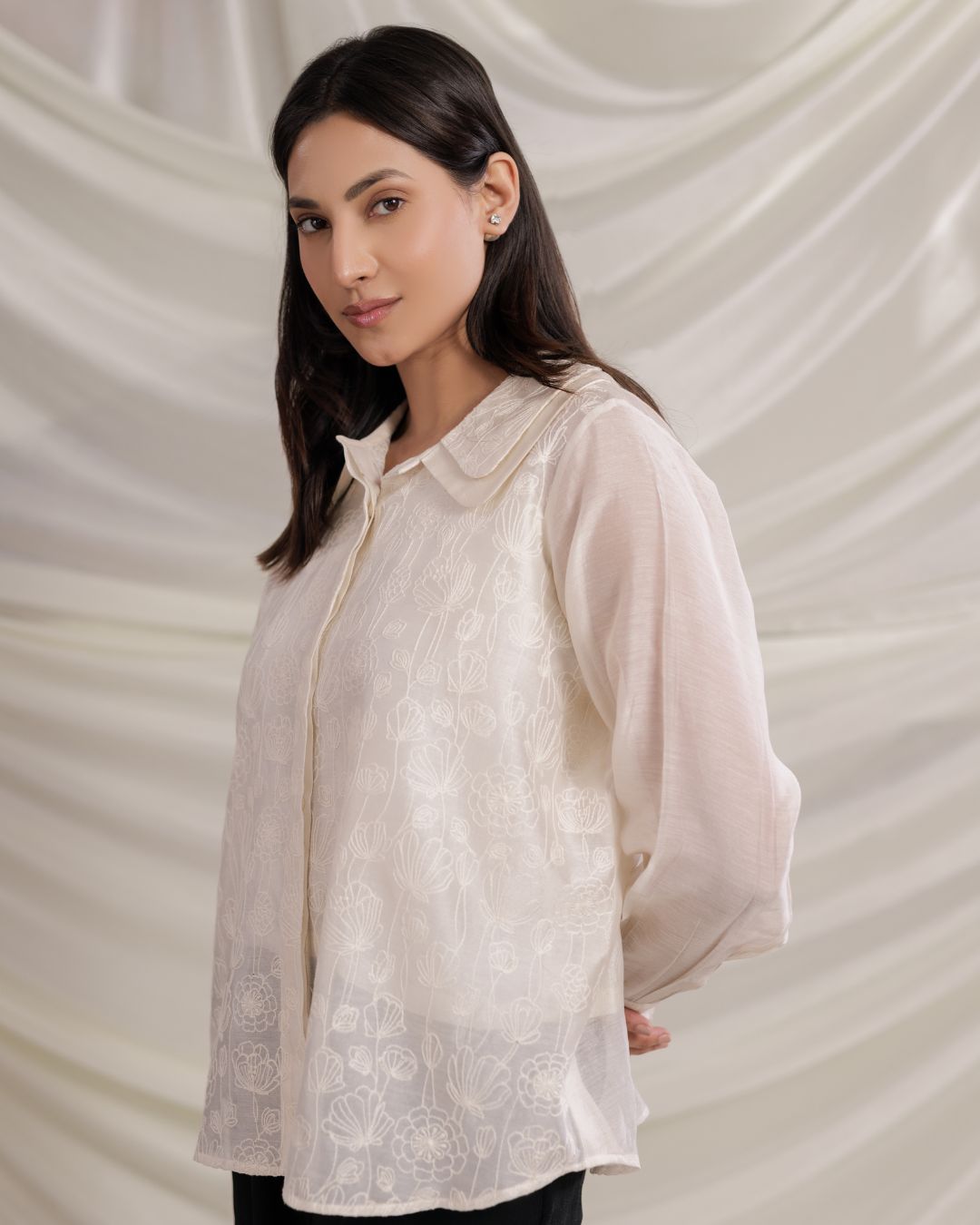 Timeless elegance meets artisanal charm in our Maheshwari Double Collar Shirt—a refined wardrobe essential for women who appreciate subtle luxury. Crafted from a soft, breathable Maheshwari fabric, this shirt features a sheer, lightweight silhouette adorned with delicate all-over floral embroidery, lending it a graceful and feminine touch.