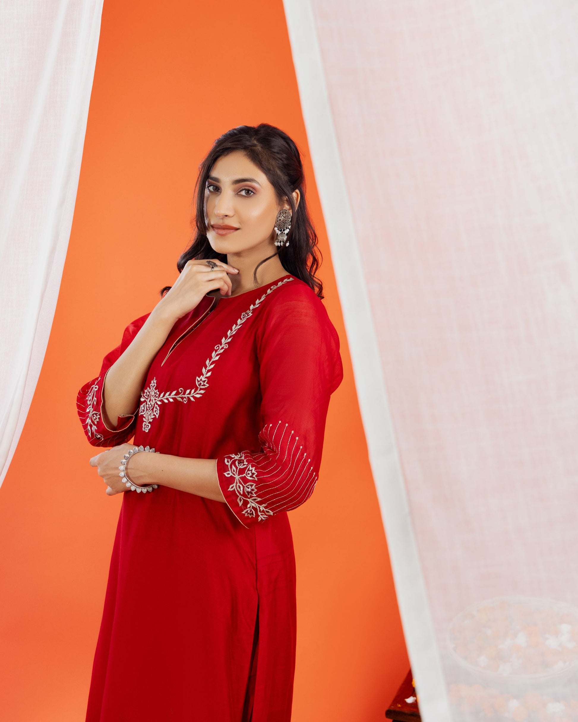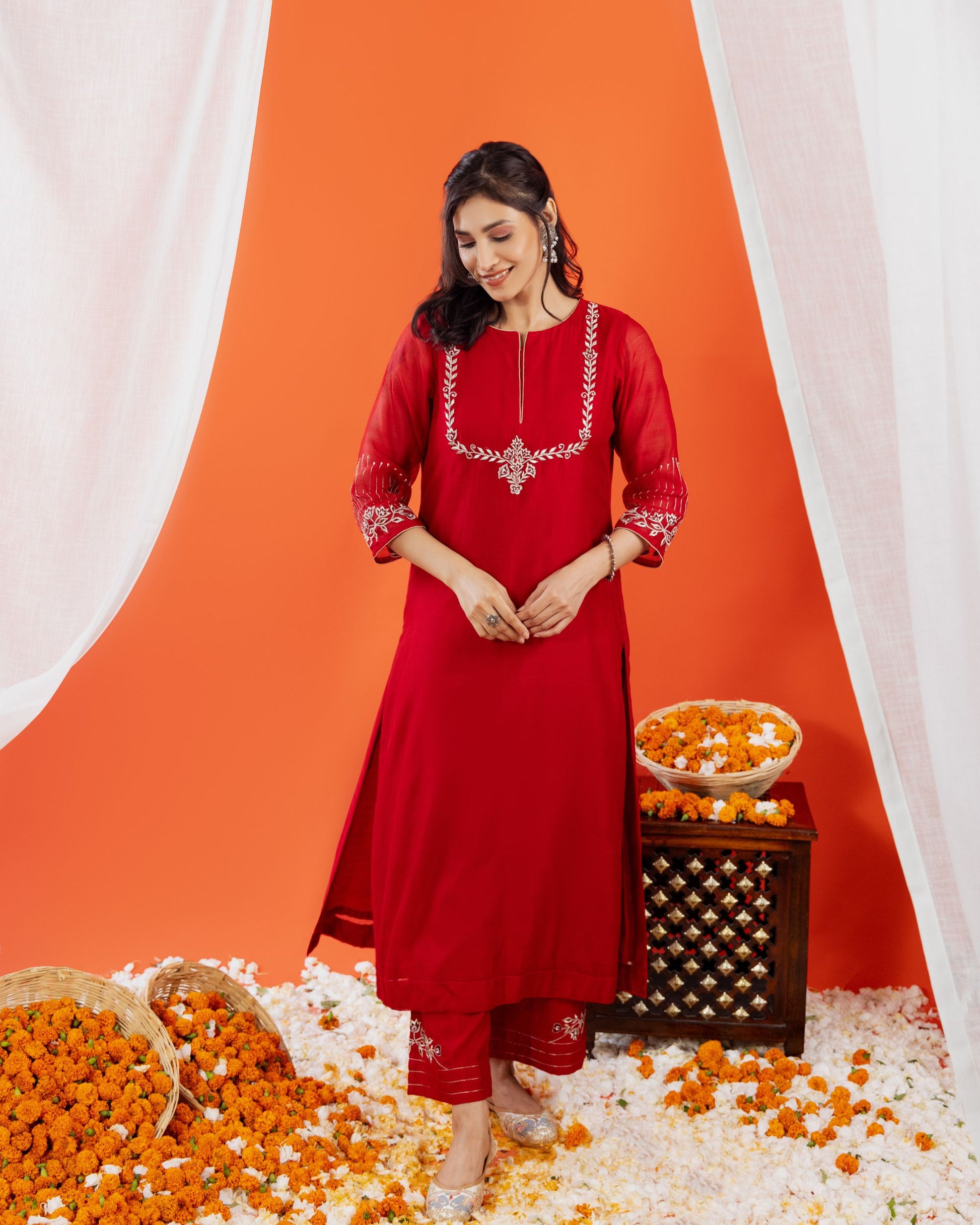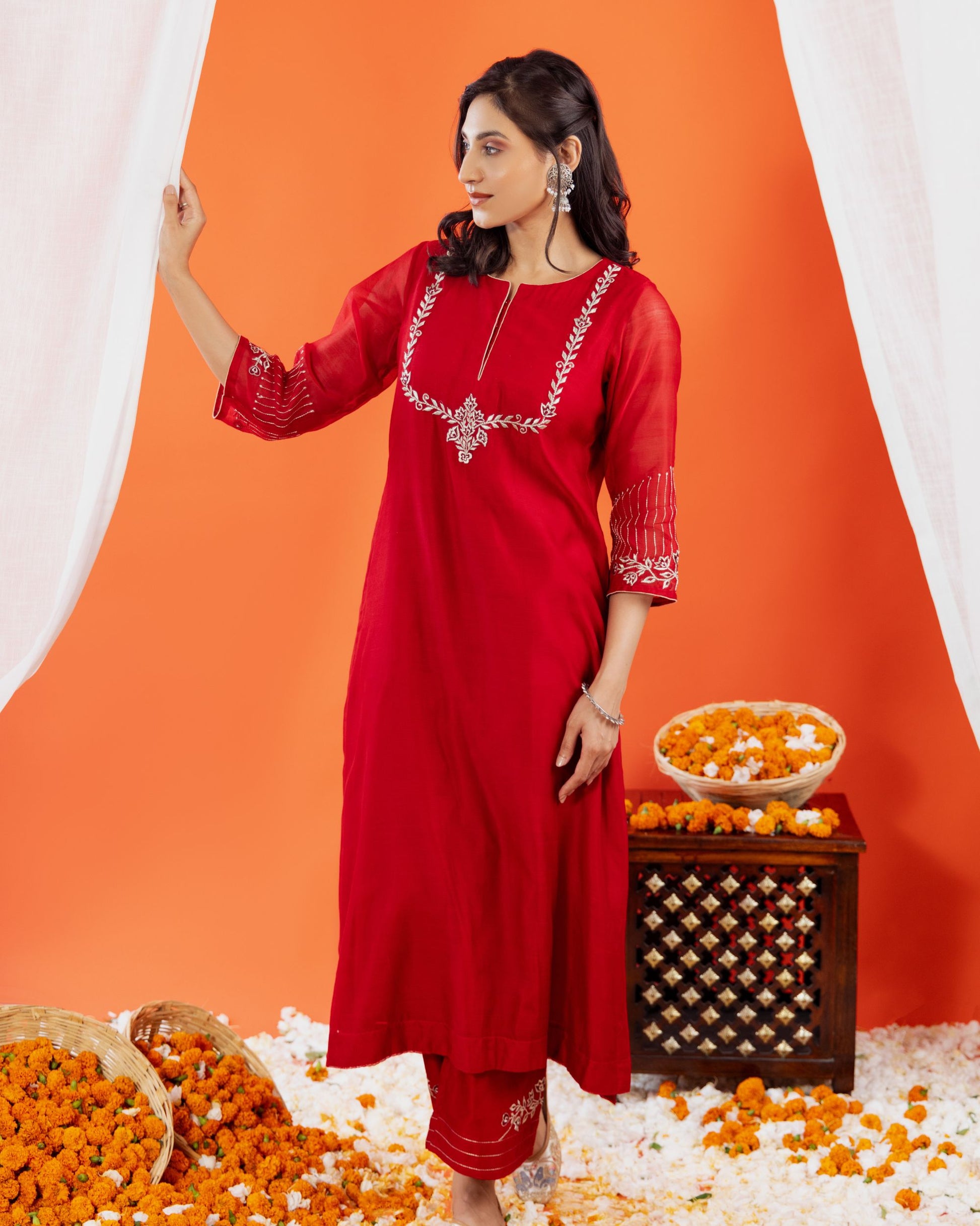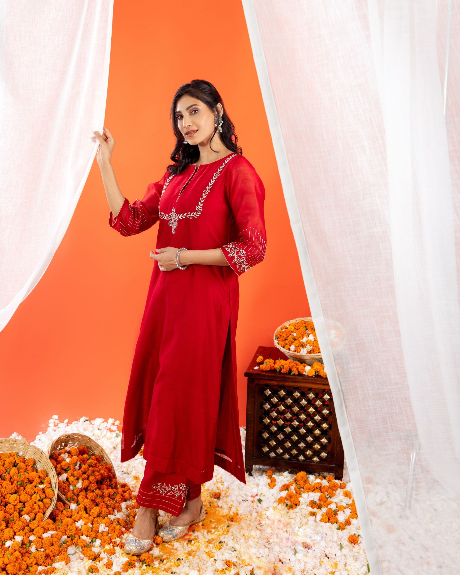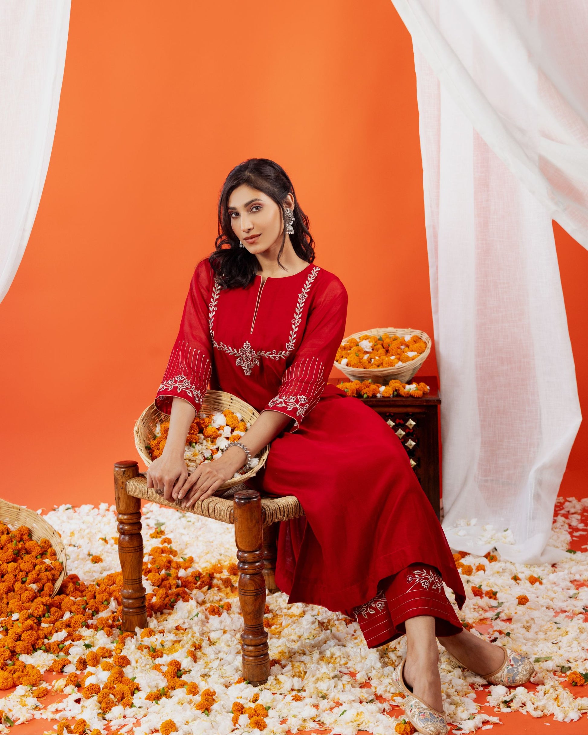 Elevate your festive style with this Maheshwari silk kurta and pant set from Panchakanya. Crafted in a striking red hue, the kurta features fine embroidery on the neckline, sleeves, and hemline, paired with straight-fit silk pants that carry delicate detailing. The rich handloom weave and breathable fabric make it a perfect blend of elegance and comfort.