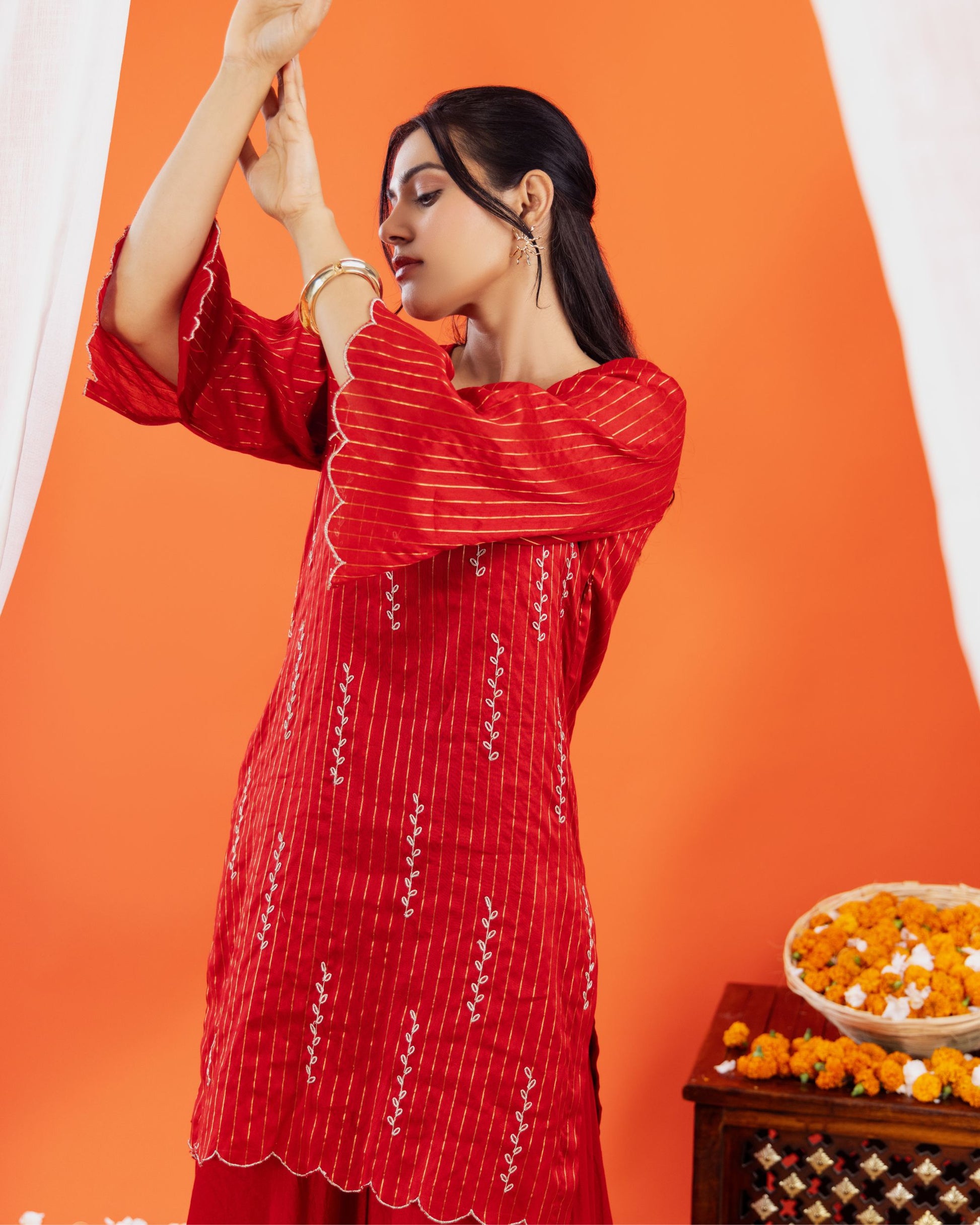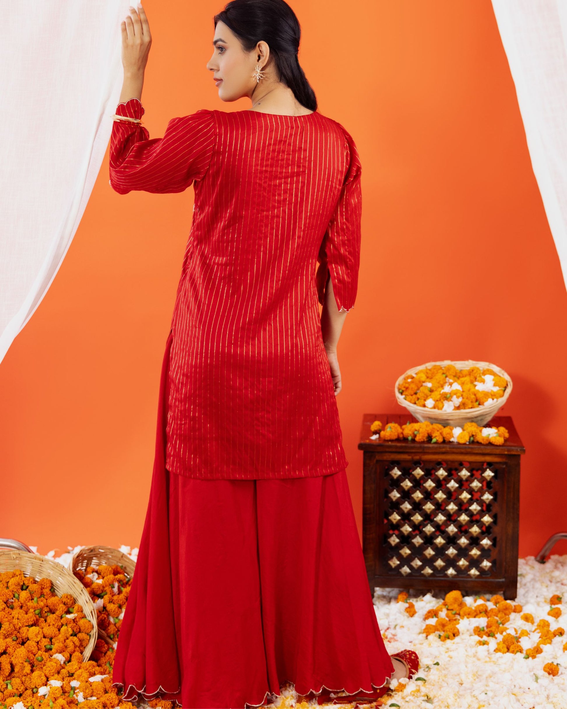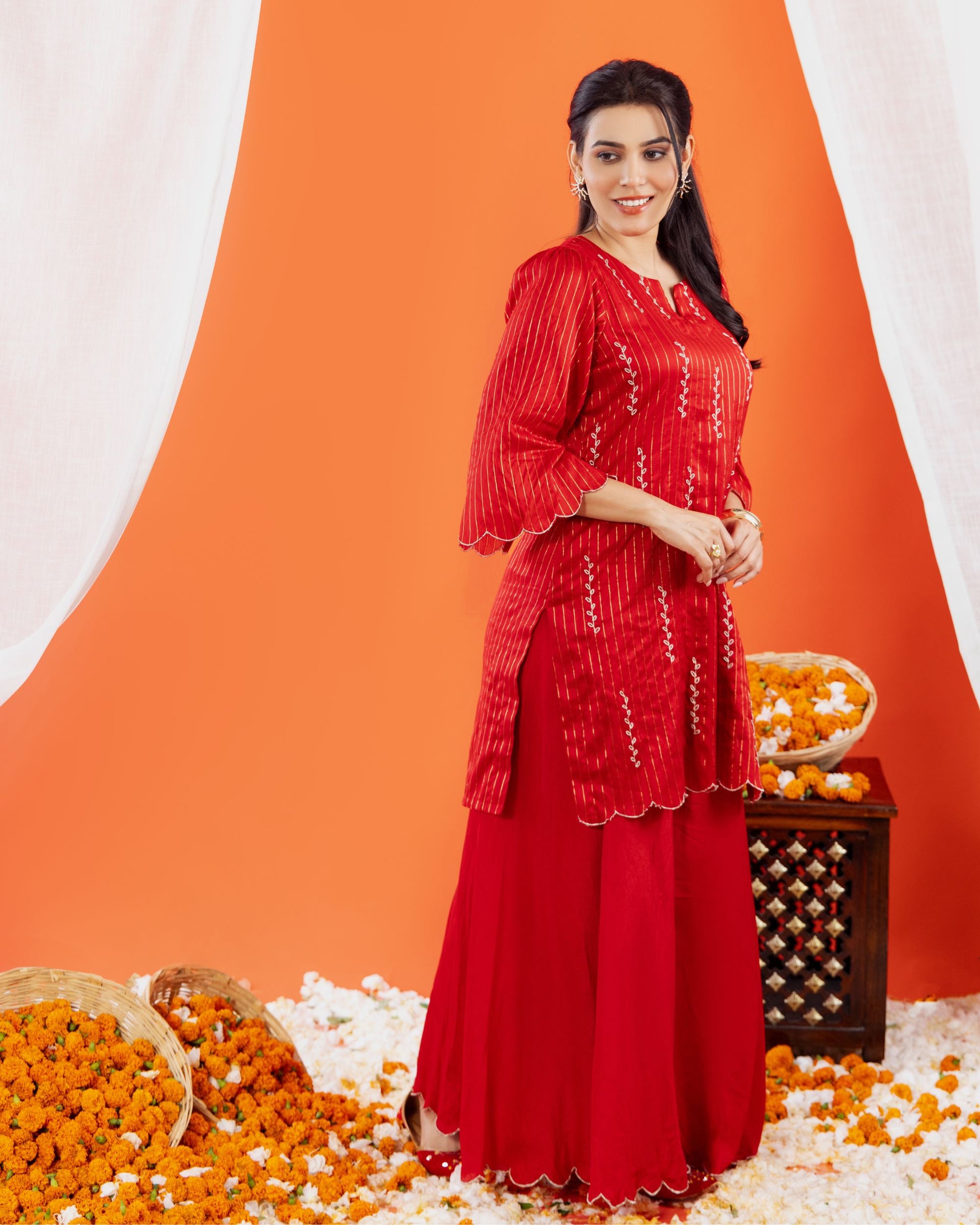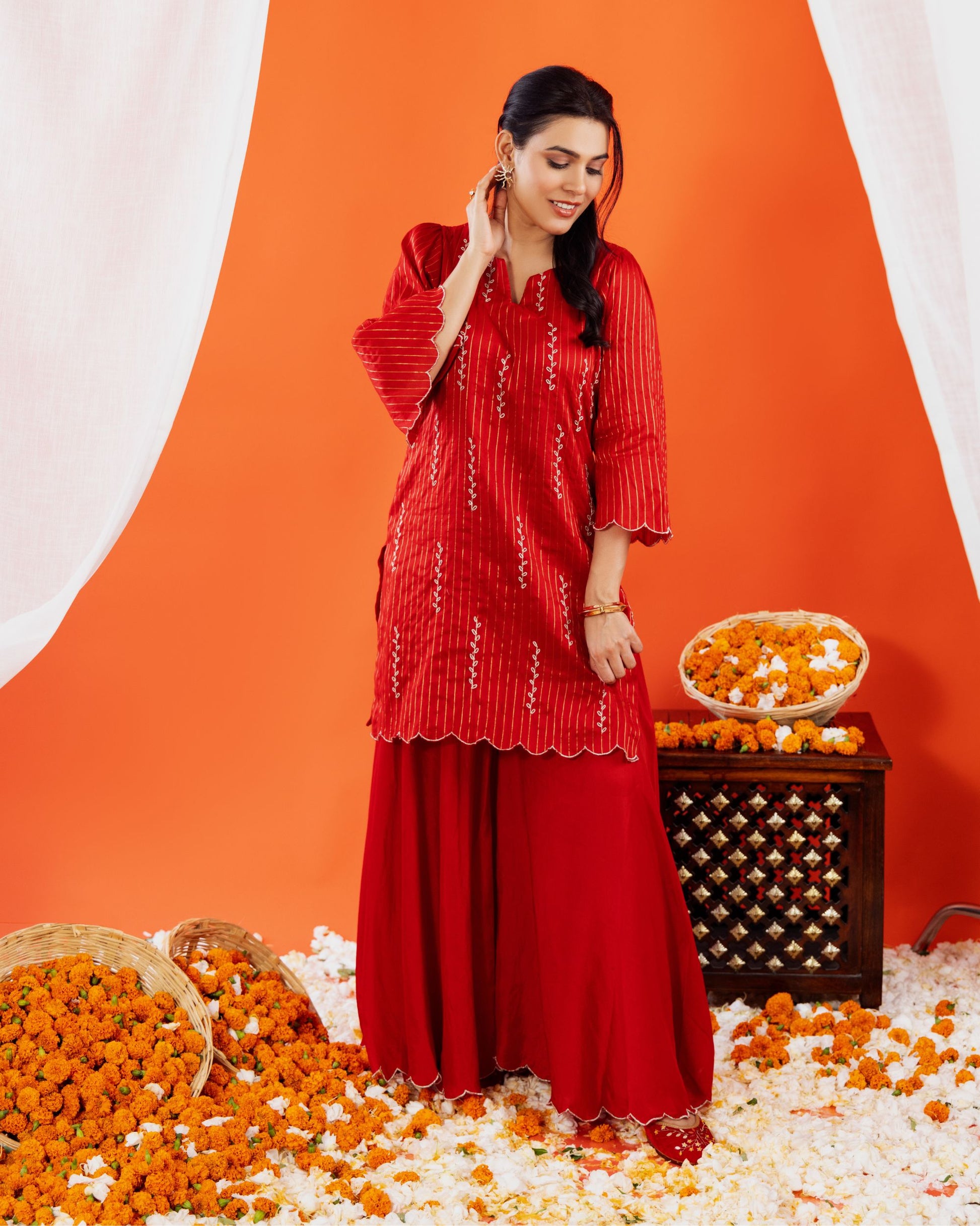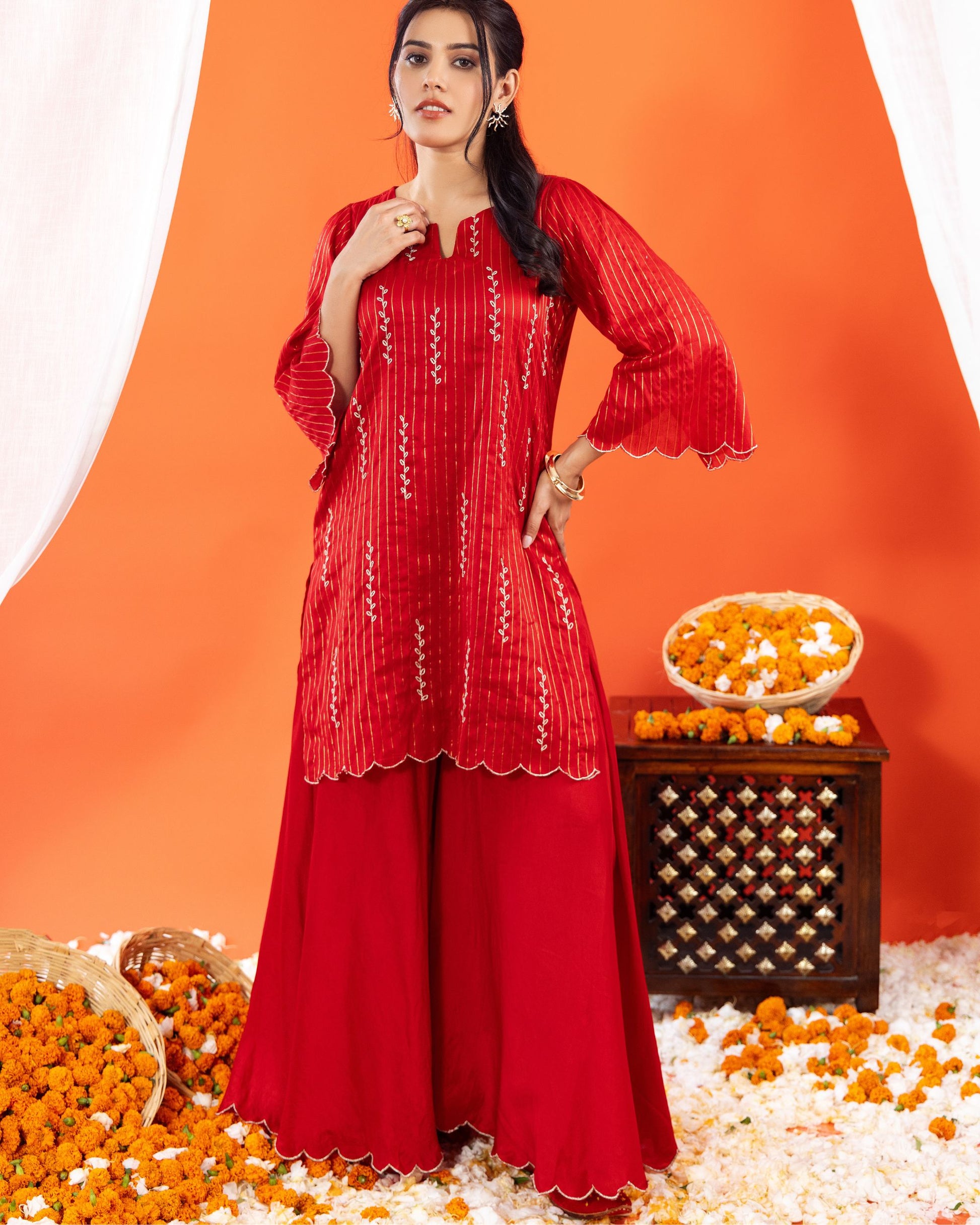Make a bold festive statement with this Maheshwari silk kurta and sharara set from Panchakanya. Crafted in a rich red hue, the handloom silk kurta features elegant embroidery with scalloped detailing on the sleeves and hemline, paired with a flowy sharara that exudes grace and sophistication.