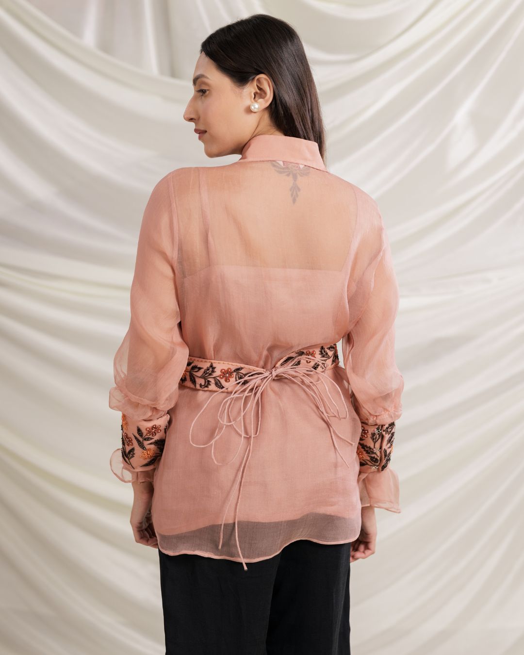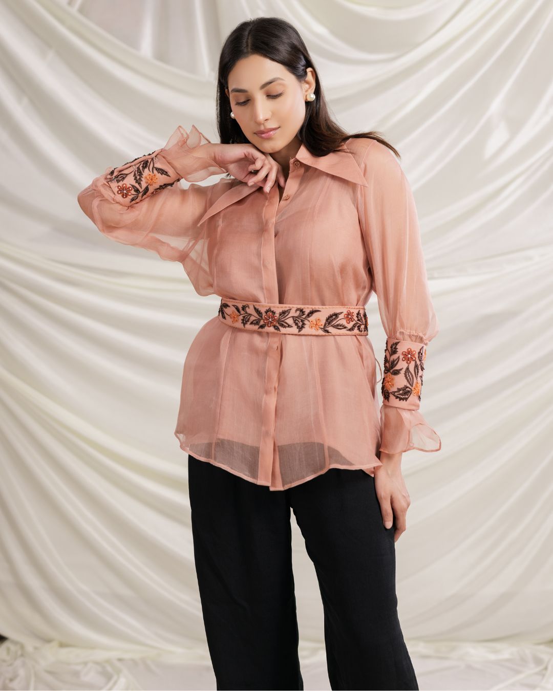 Embroidered Organza Shirt Top with Belt & Inner – Peach Elegance | Sheer Organza Top for Women By Panchakanya