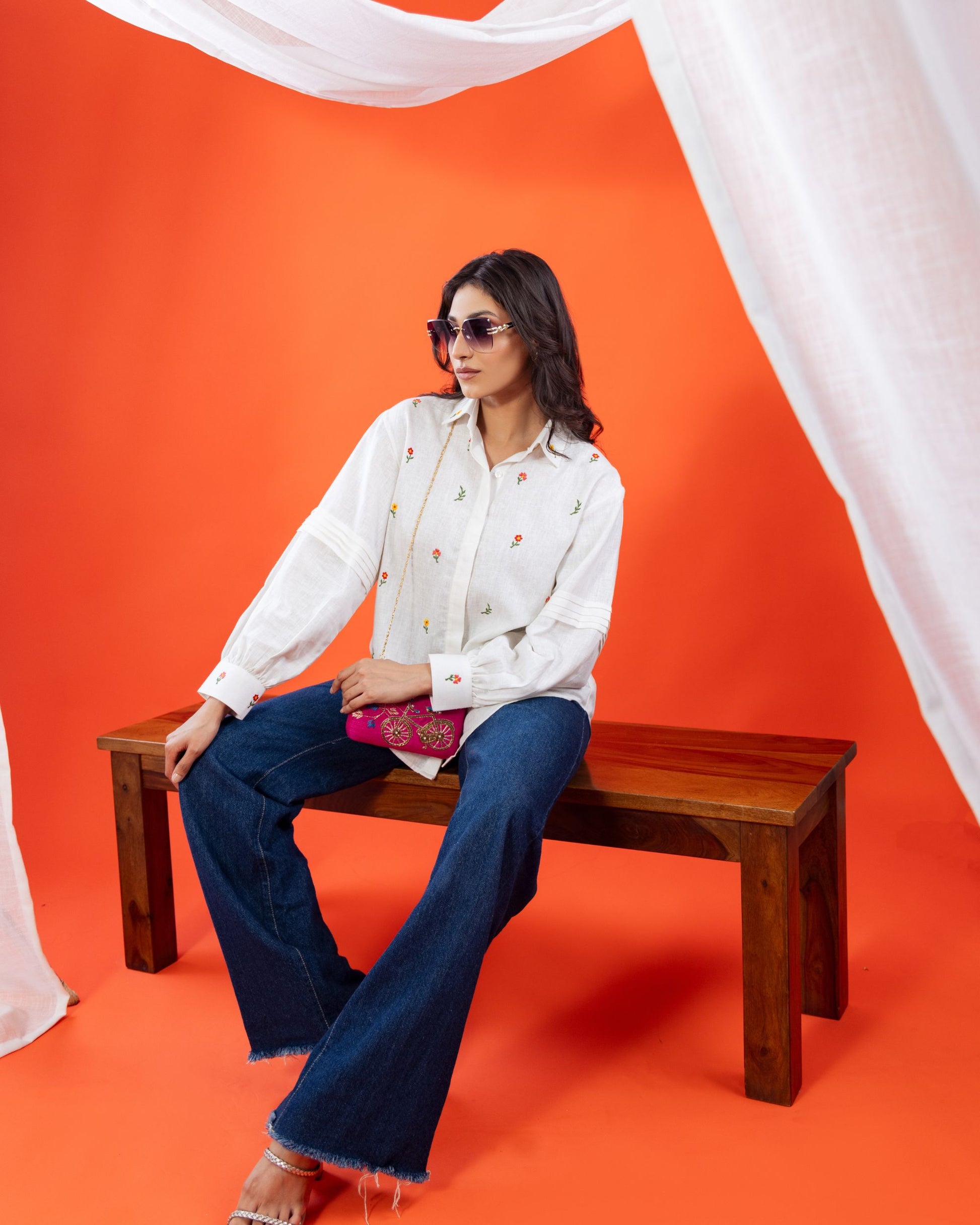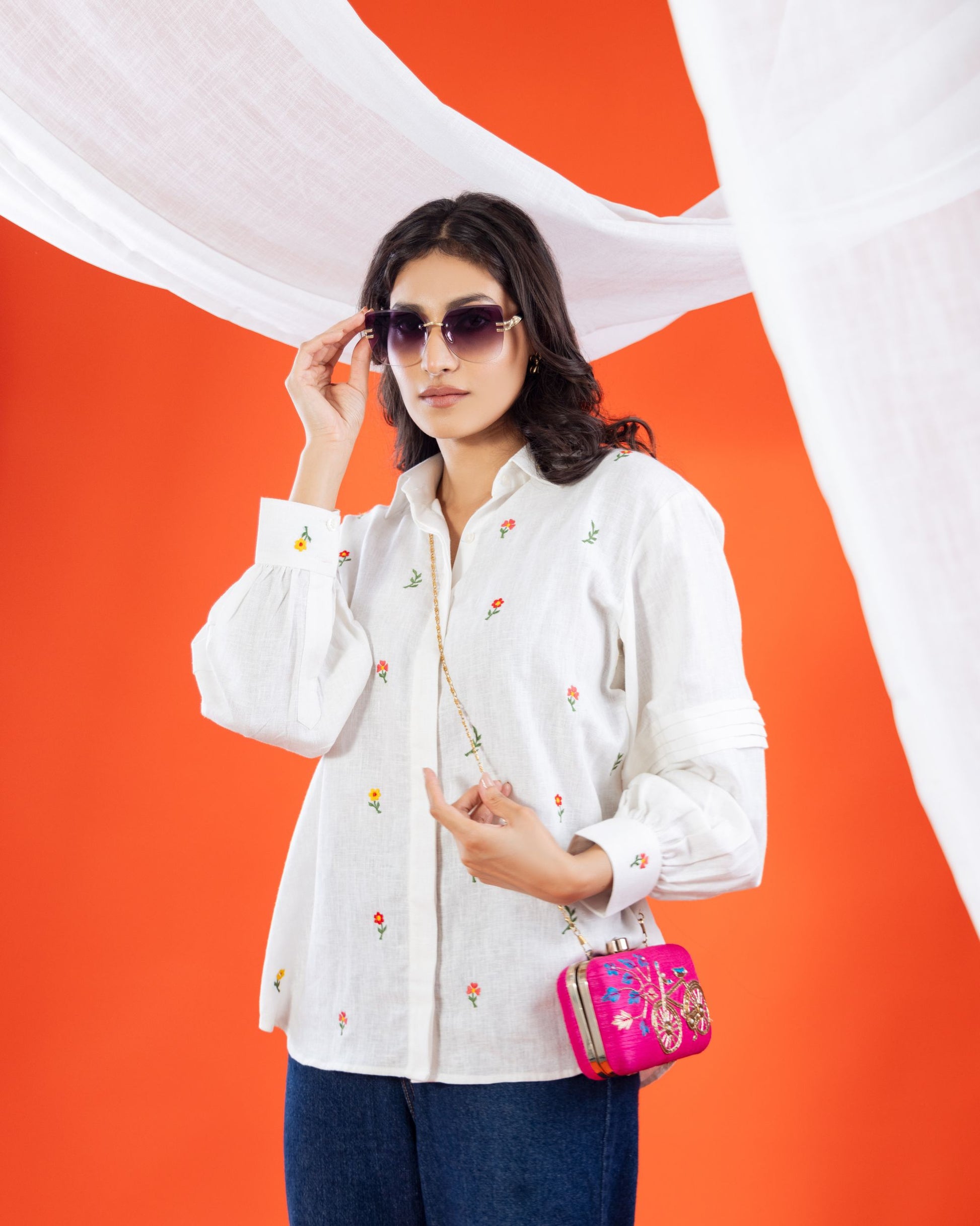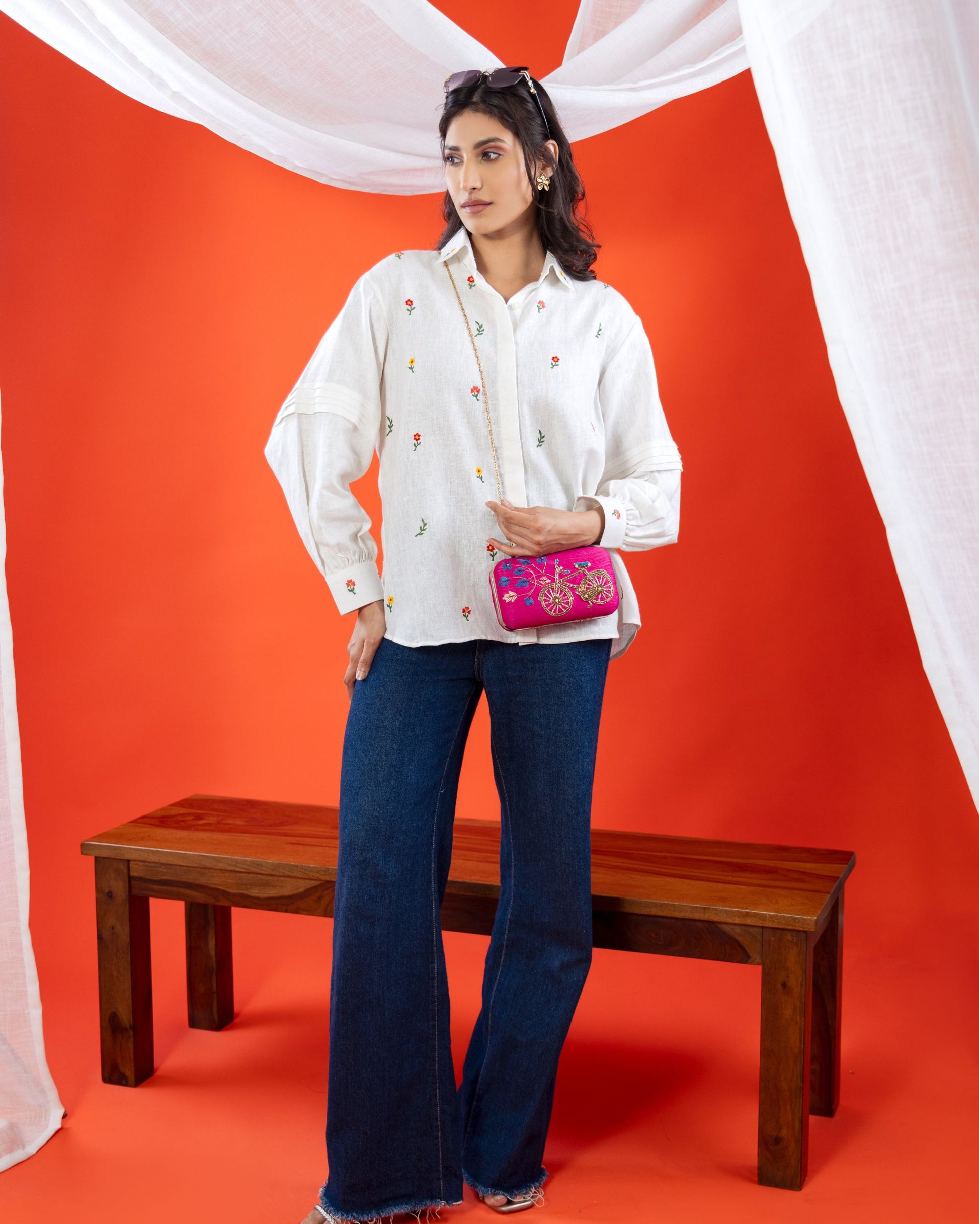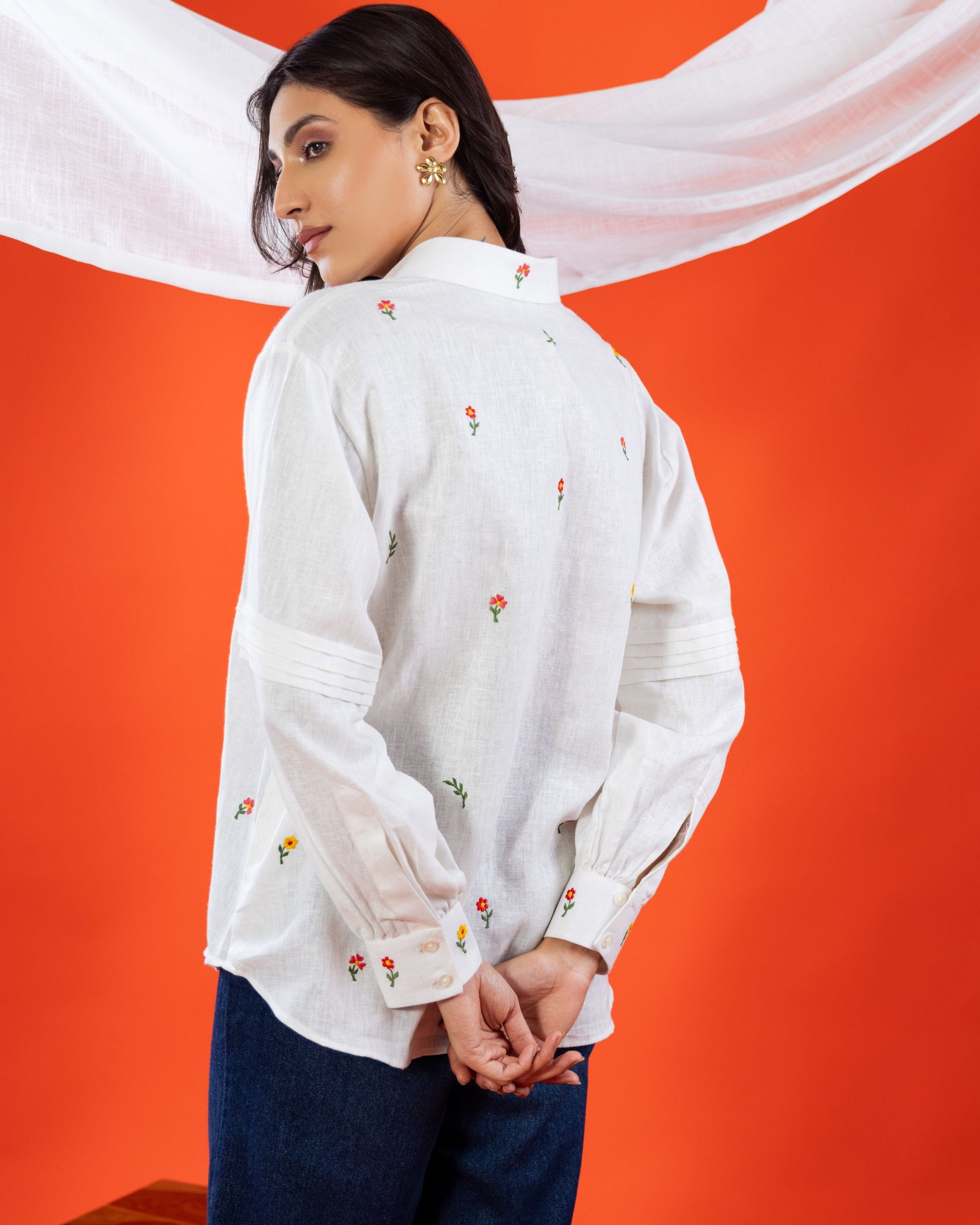 Linen Embroidered Shirt Style Top for Women – Full Sleeve White Button Down | Panchakanya Sustainable Fashion