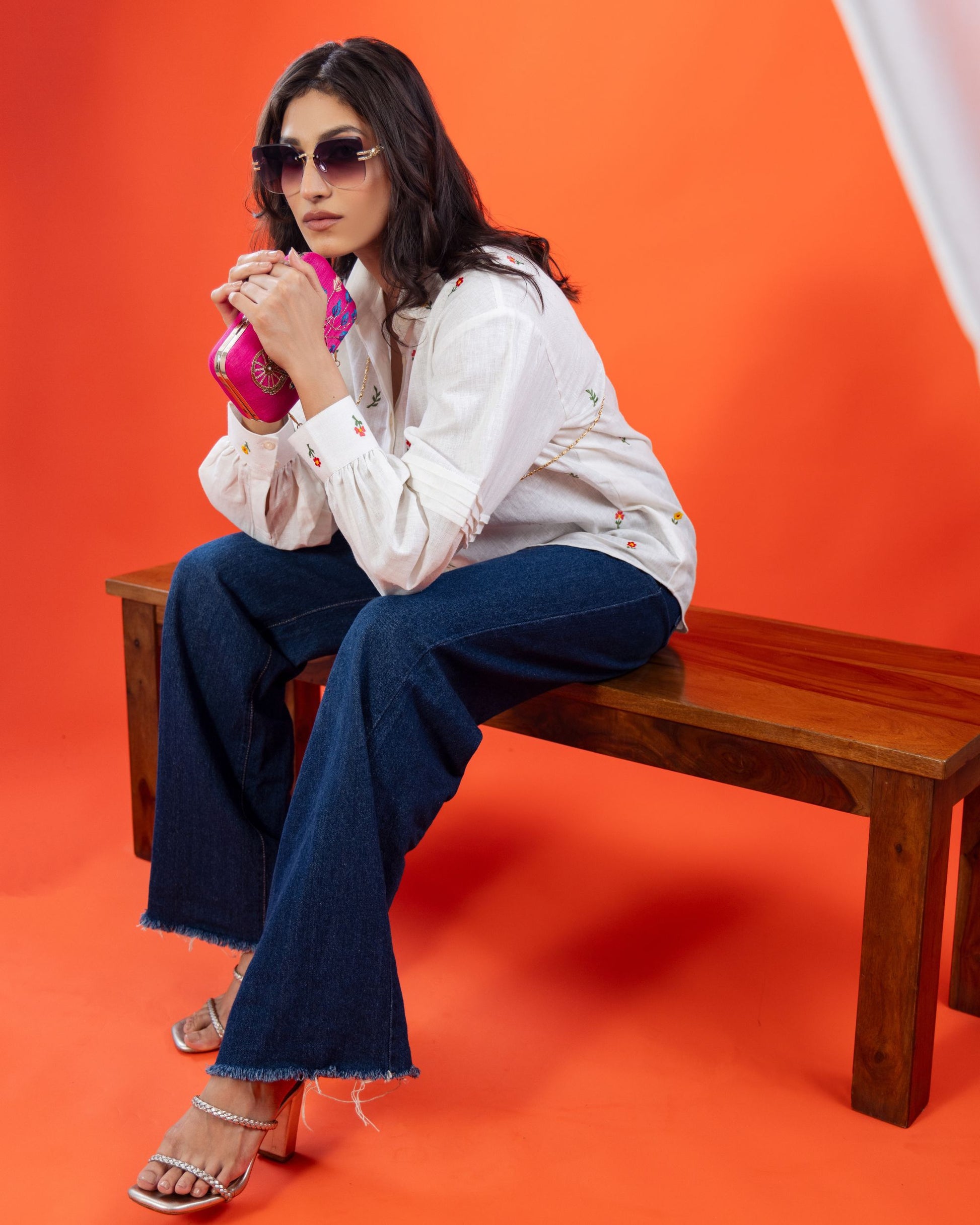 Add timeless elegance to your wardrobe with Panchakanya’s Linen Full Sleeve Embroidered Shirt Style Top for Women. Crafted from a breathable cotton-linen blend, this eco-friendly white button-down features delicate multicolor floral embroidery, making it a versatile choice for work, casual outings, or festive occasions. A perfect pick for women seeking stylish linen tops in India from sustainable fashion brands.