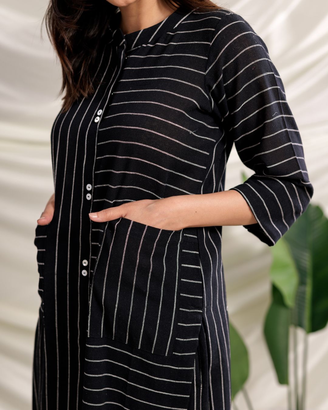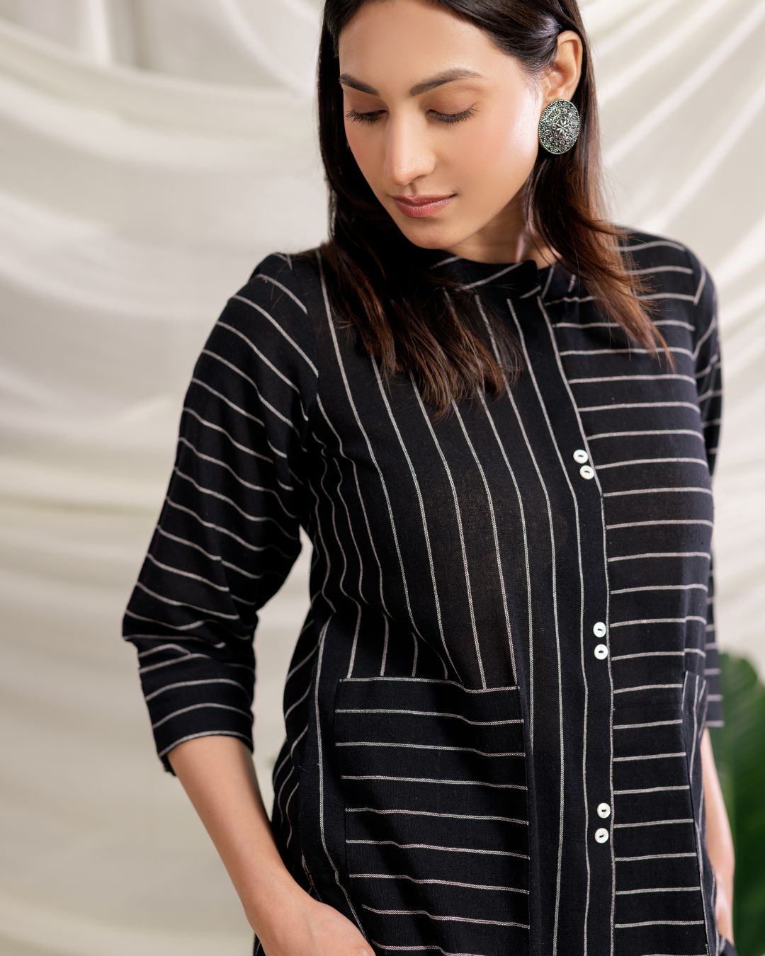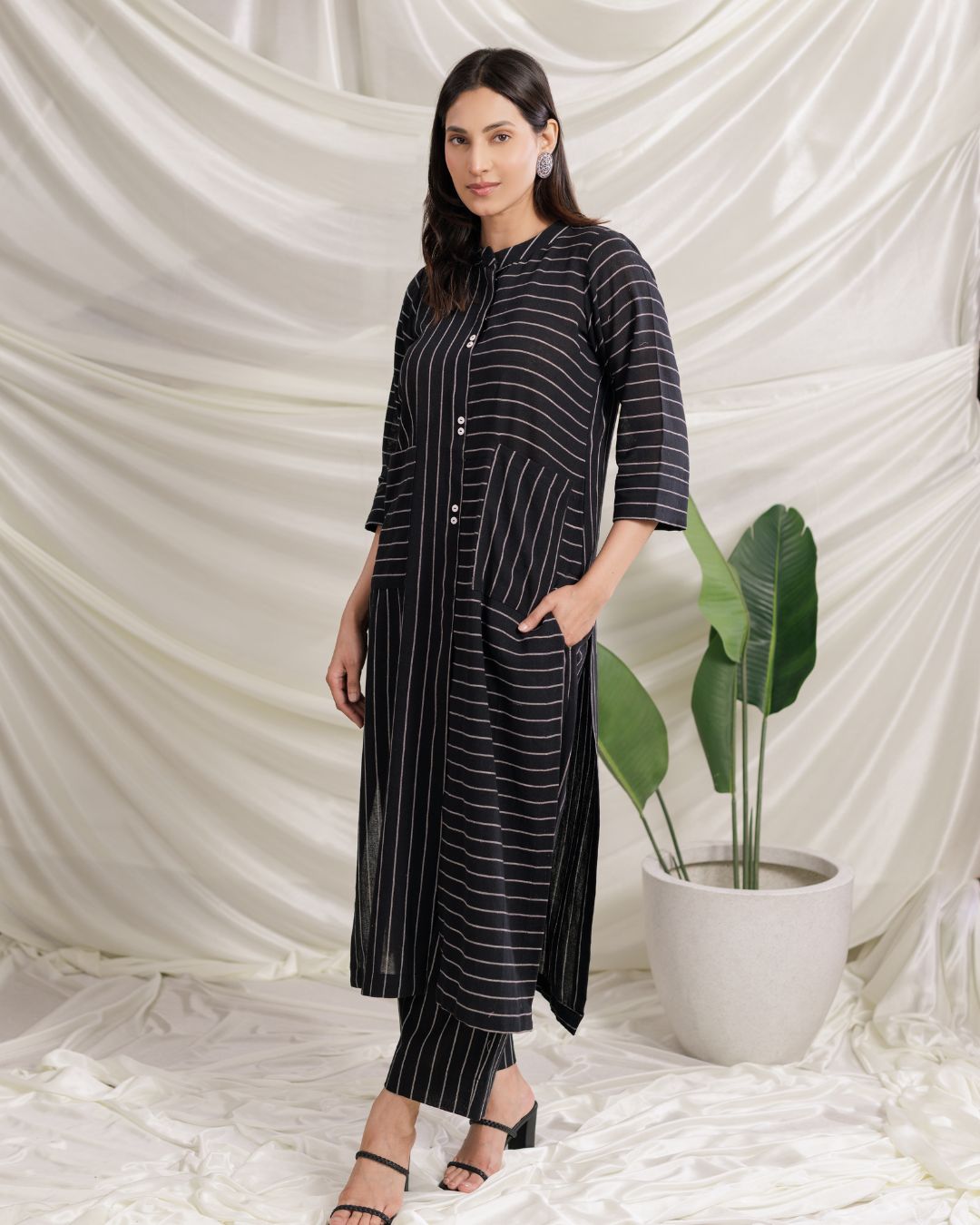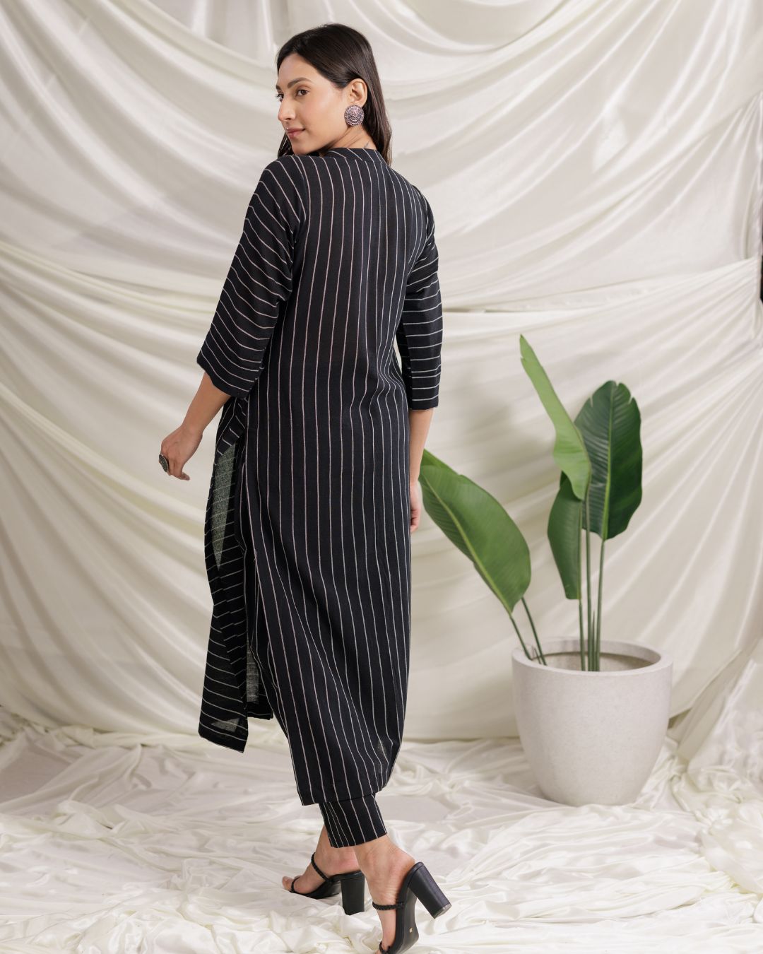 Step into comfort and conscious fashion with this elegant black striped kurta set from Panchakanya, thoughtfully crafted in organic Kala cotton. Grown in the arid lands of Kutch without synthetic pesticides or irrigation, Kala cotton is one of India’s most sustainable and heritage-rich textiles—perfect for the mindful dresser.
