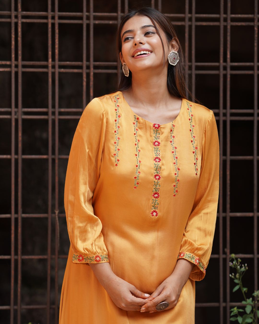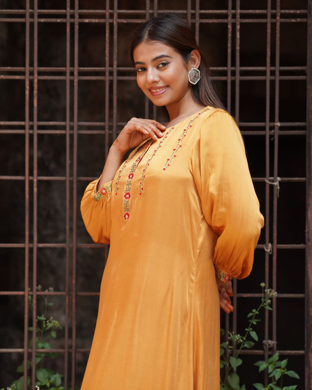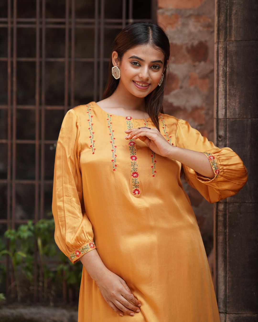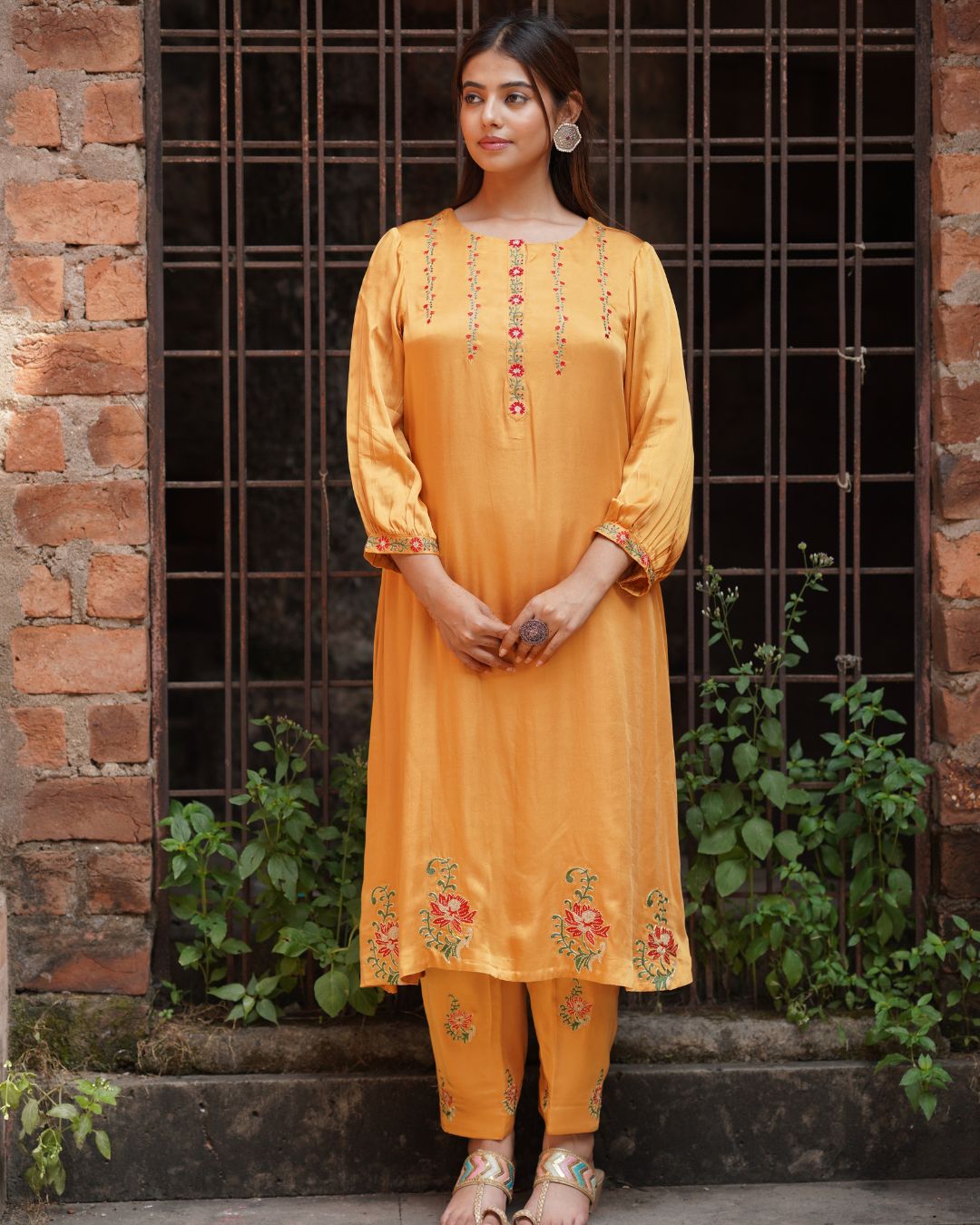 - Elevate Your Style: Crafted in luxurious modal silk, this kurta set for women exudes elegance, blending traditional ethnic wear with a modern twist.