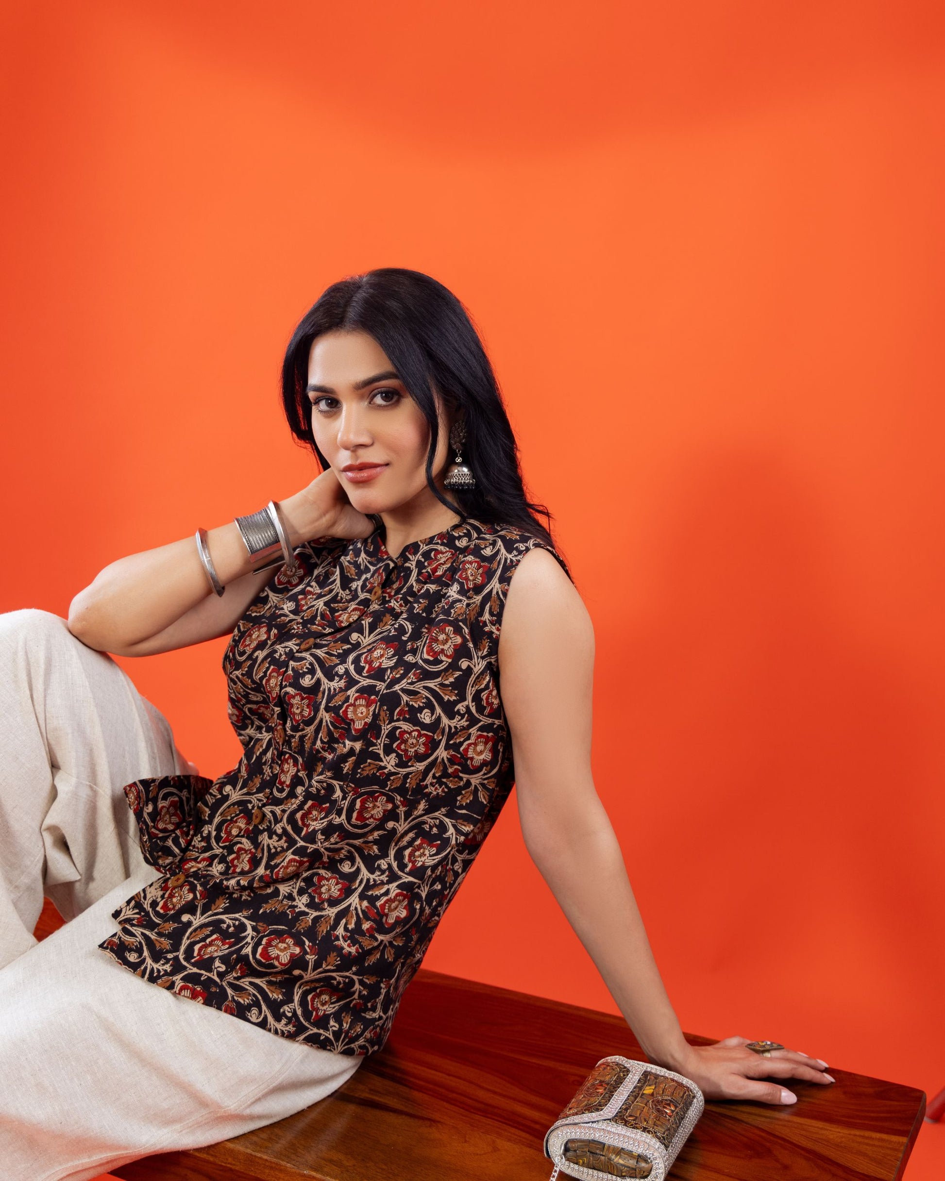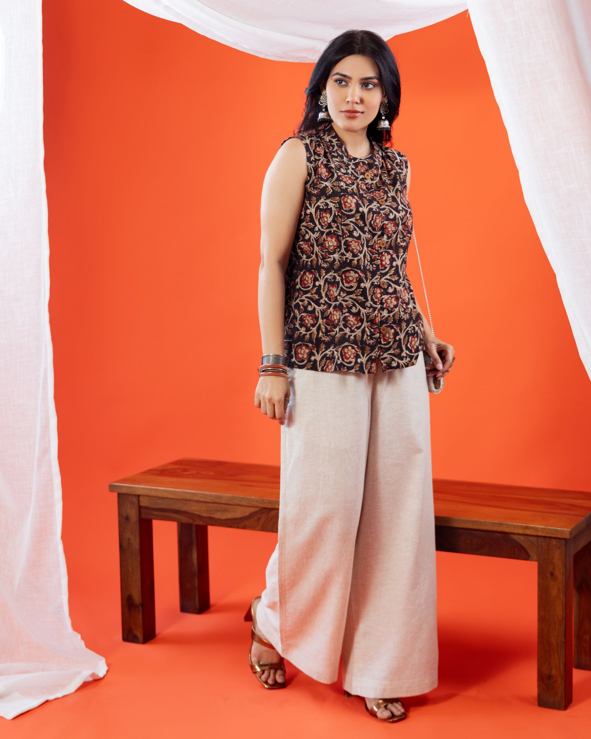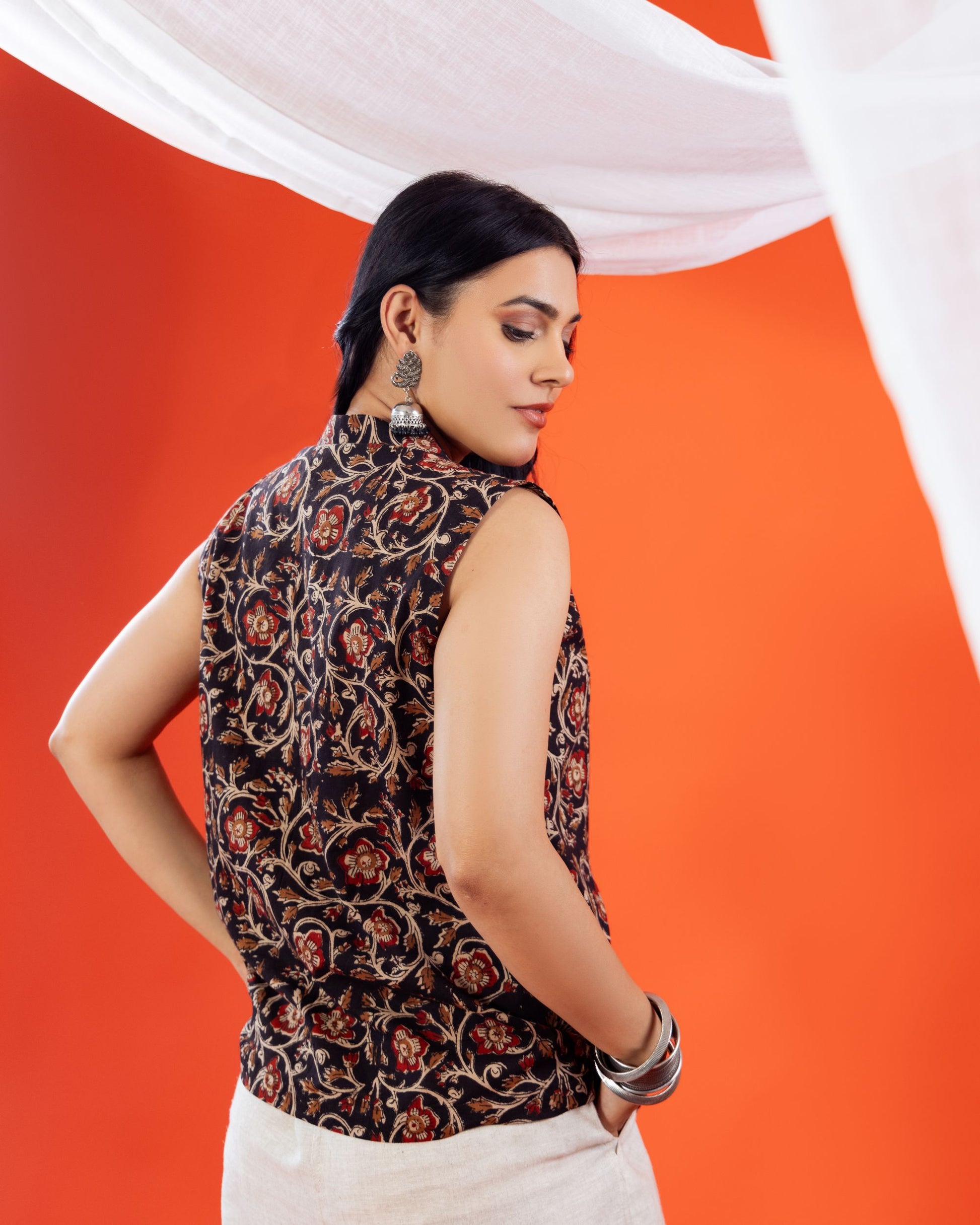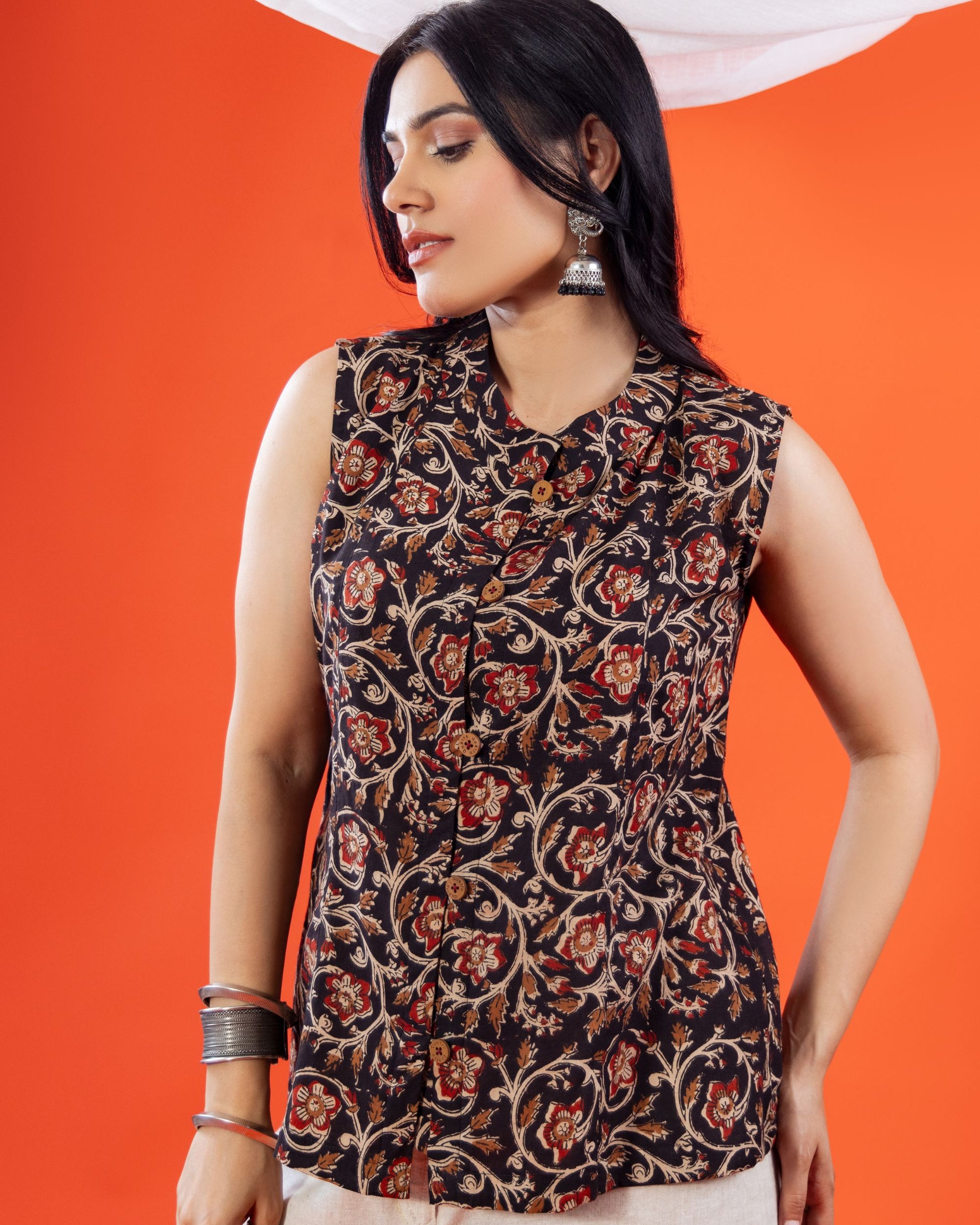 Add a touch of heritage charm to your wardrobe with this Sanganeri cotton princess top by Panchakanya. Crafted from authentic hand-block printed cotton, this sleeveless top features intricate floral motifs in earthy tones, making it a versatile pick for both casual and festive occasions.