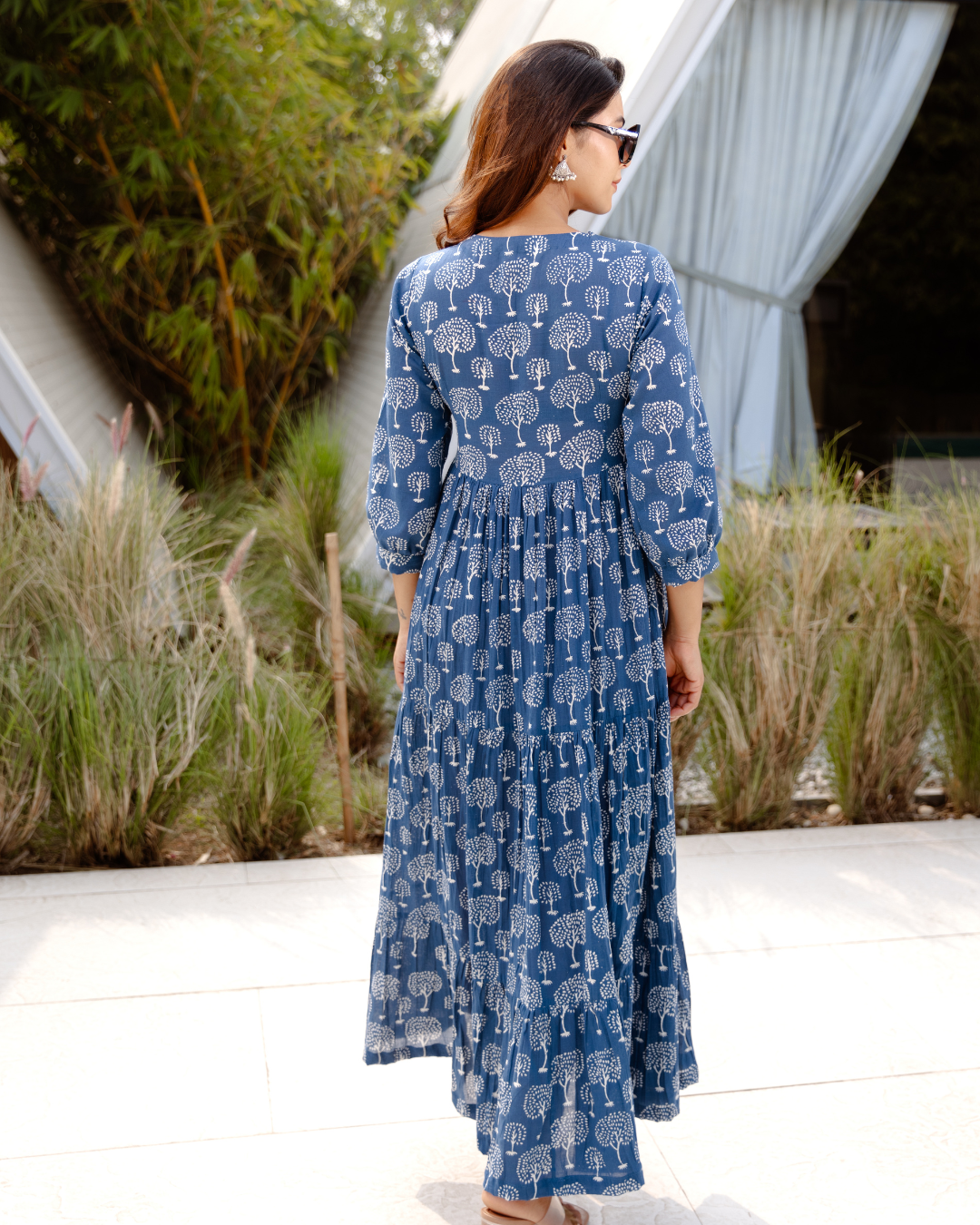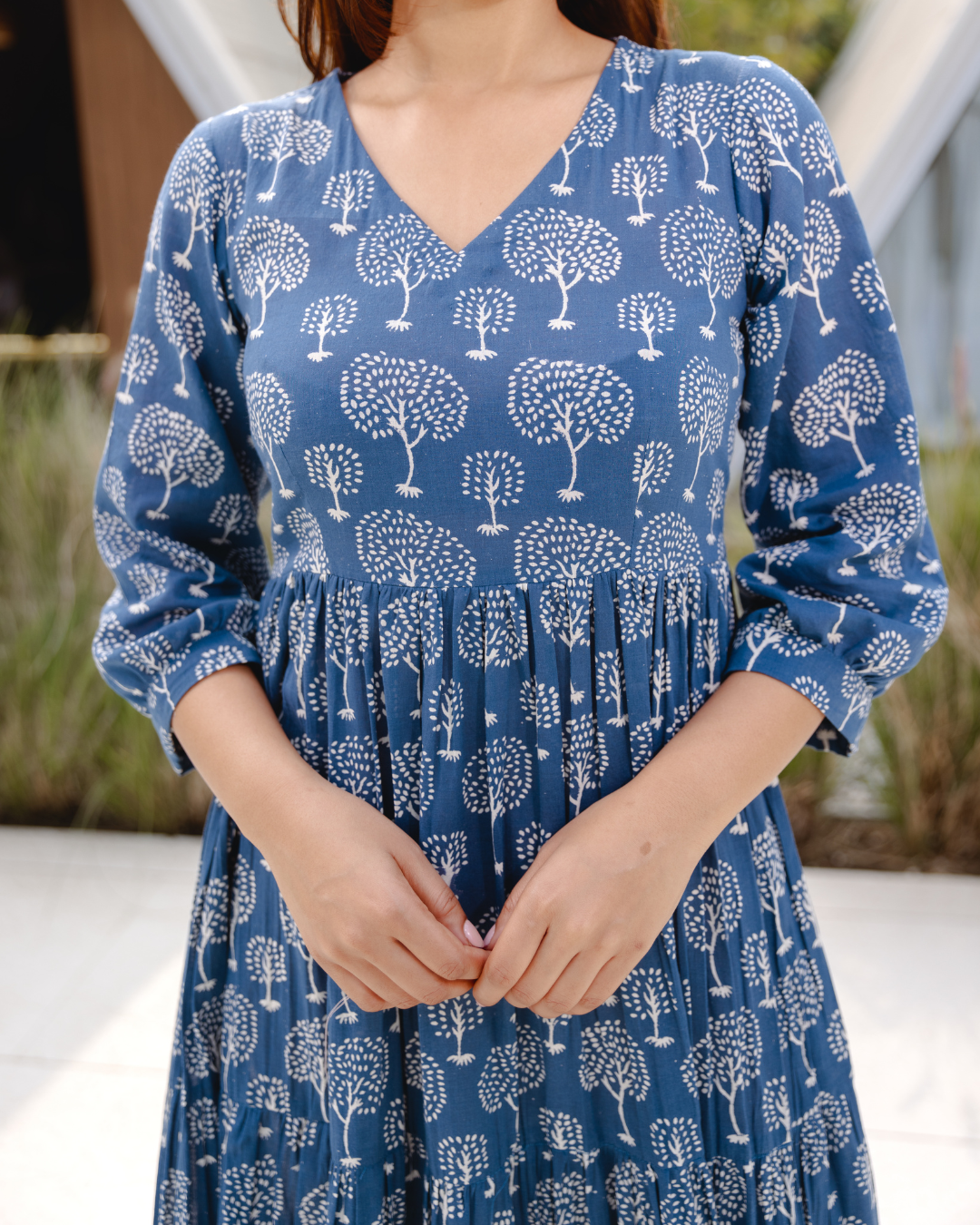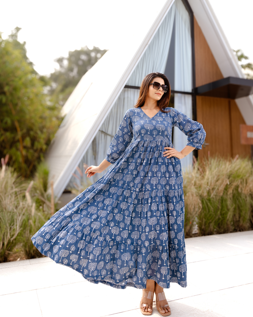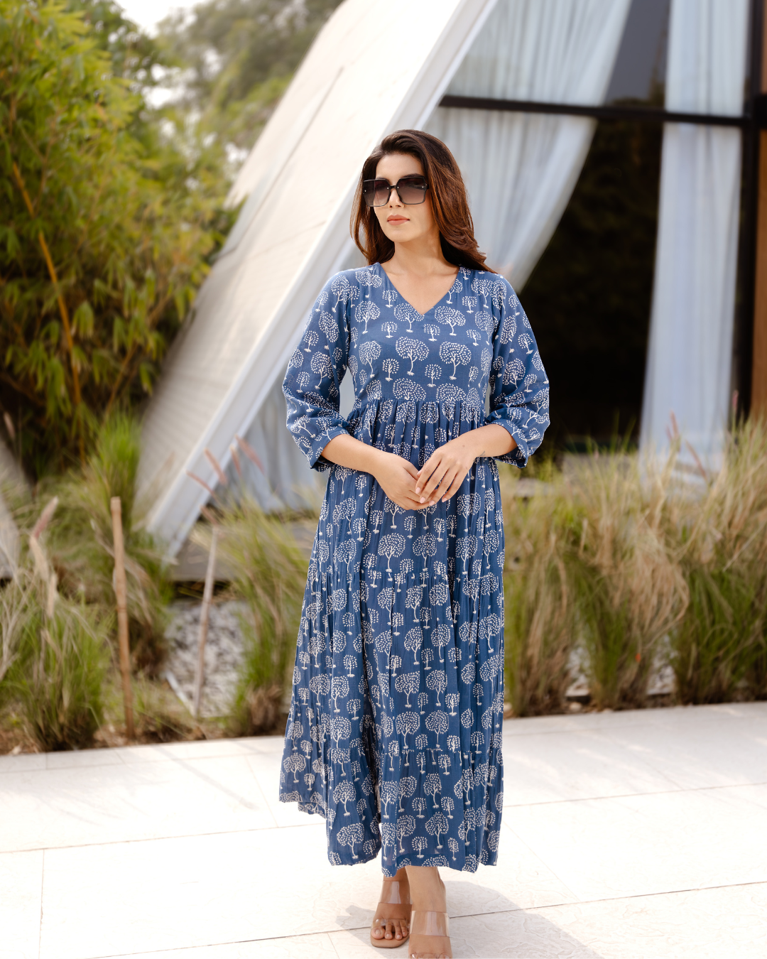Stylish Indigo Cotton Frock with 3/4 Sleeves - Comfortable Printed Maxi Dress for Women
