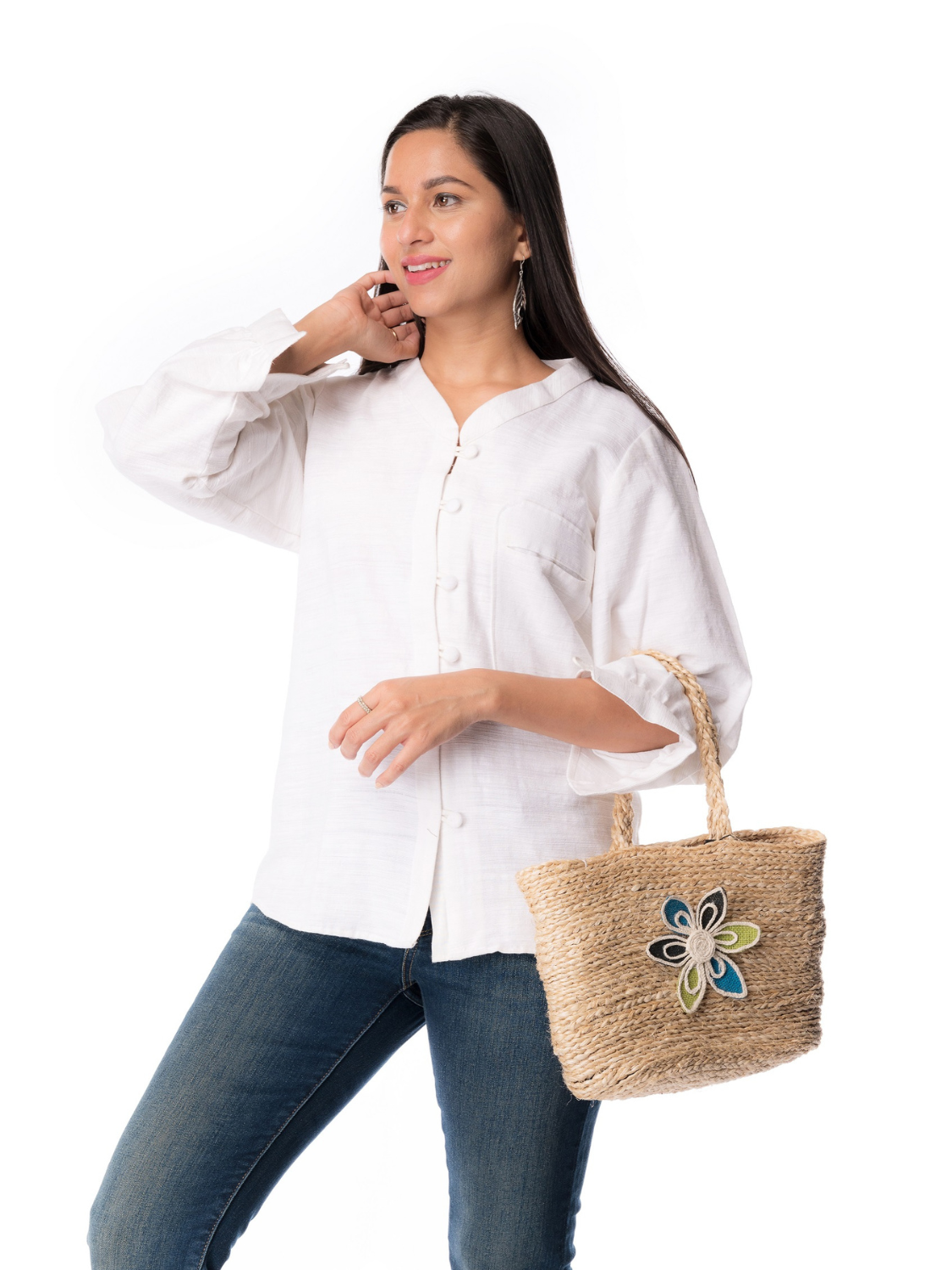 Cotton V Neck Stand Collar White Shirt For Women's Girls & Ladies - Panchakanya Clothing