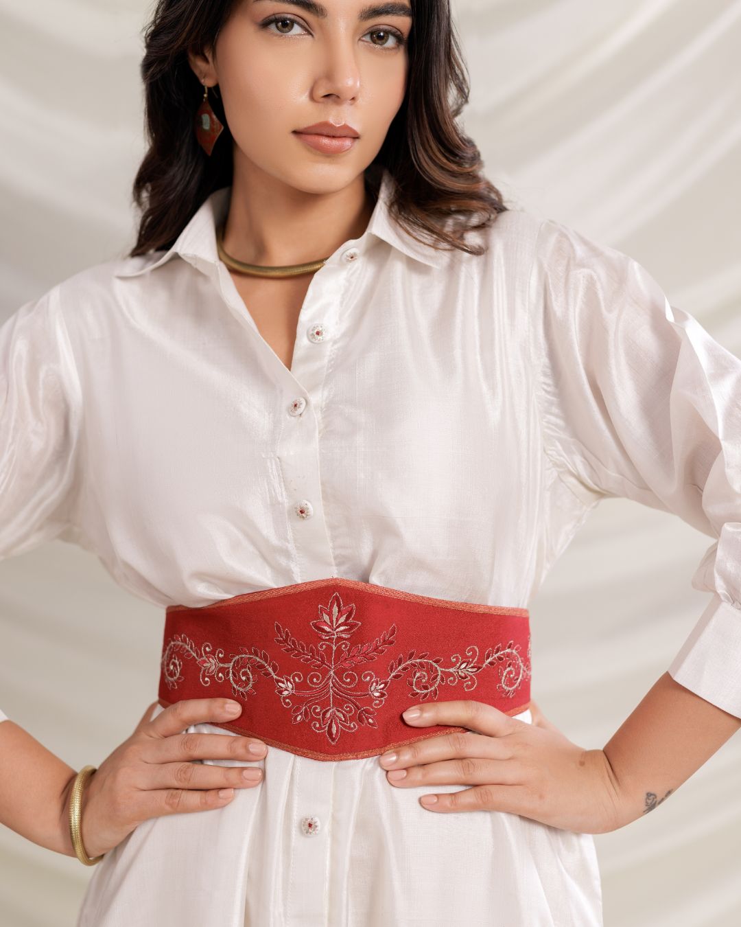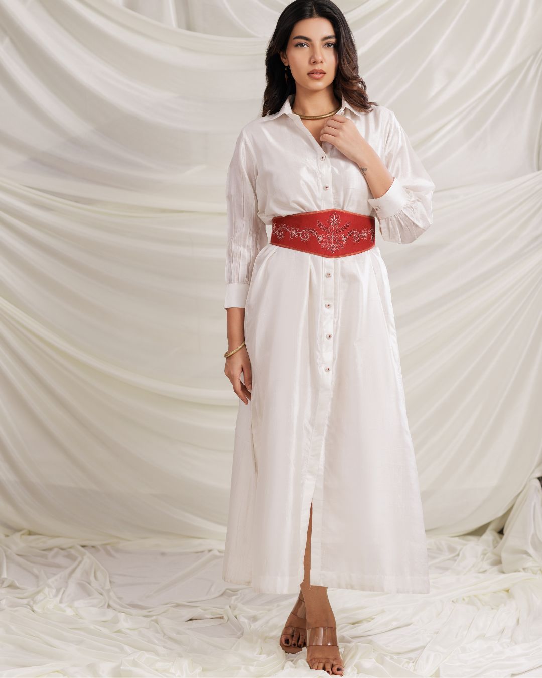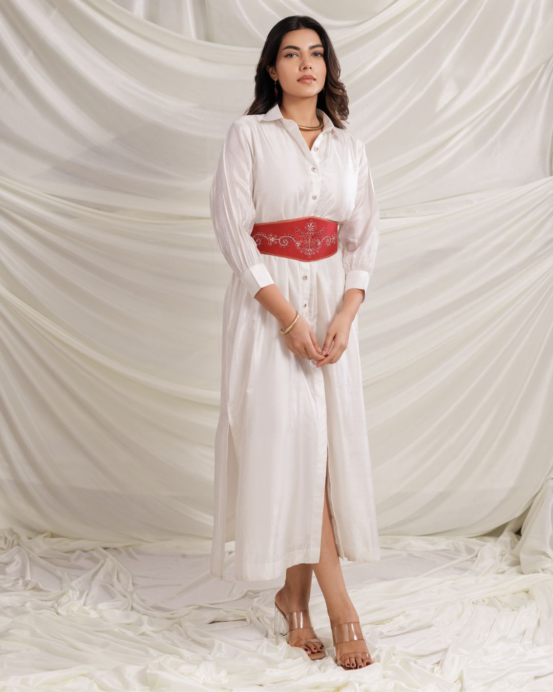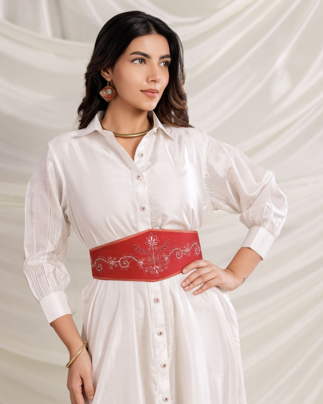 White Mulberry Silk Dress with Red Embroidered Waist Belt | Silk Button-Down Dress For Woman's By Panchakanya