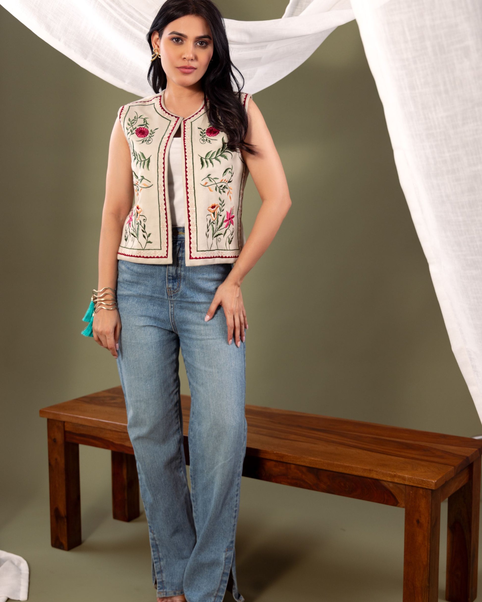 Whether styled casually with jeans and a tee or layered over ethnic wear for festive occasions, this embroidered denim jacket is a true statement piece for modern women who love experimenting with fusion fashion.