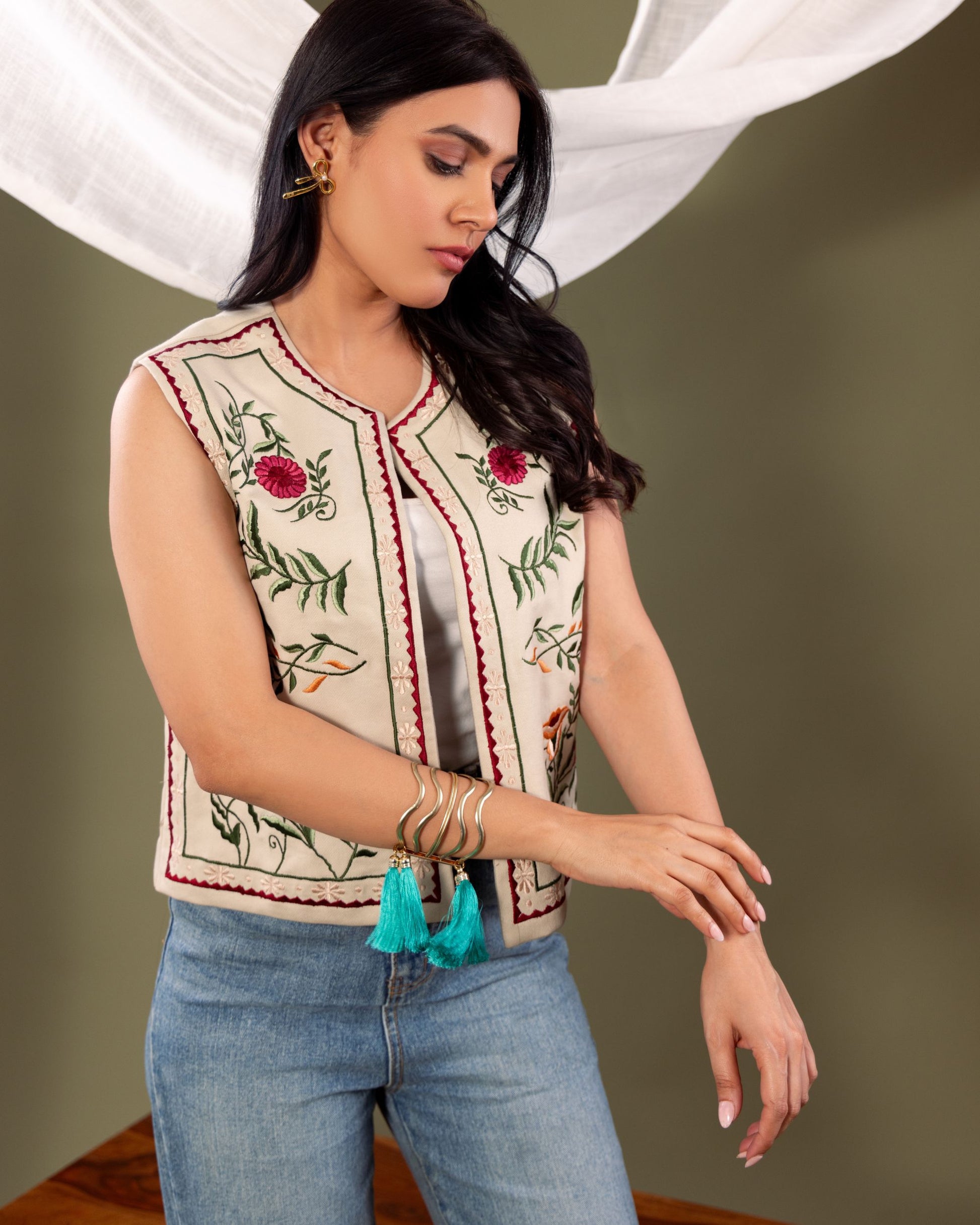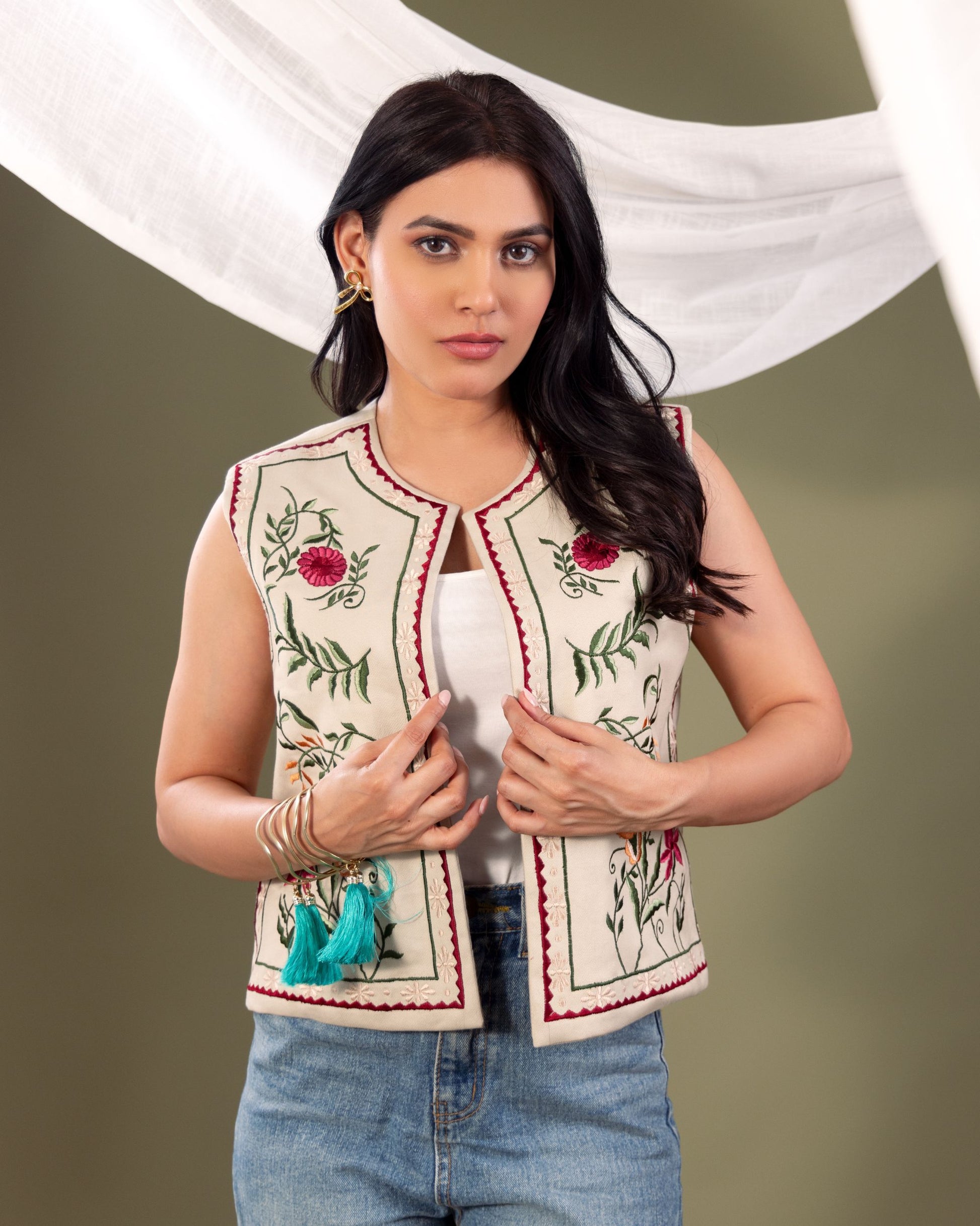 The open-front design makes it a versatile layering piece that pairs effortlessly with tops, dresses, or kurtas. Its statement embroidery, detailed edges, and tassel accents add a vibrant, handcrafted feel that elevates even the simplest outfit.