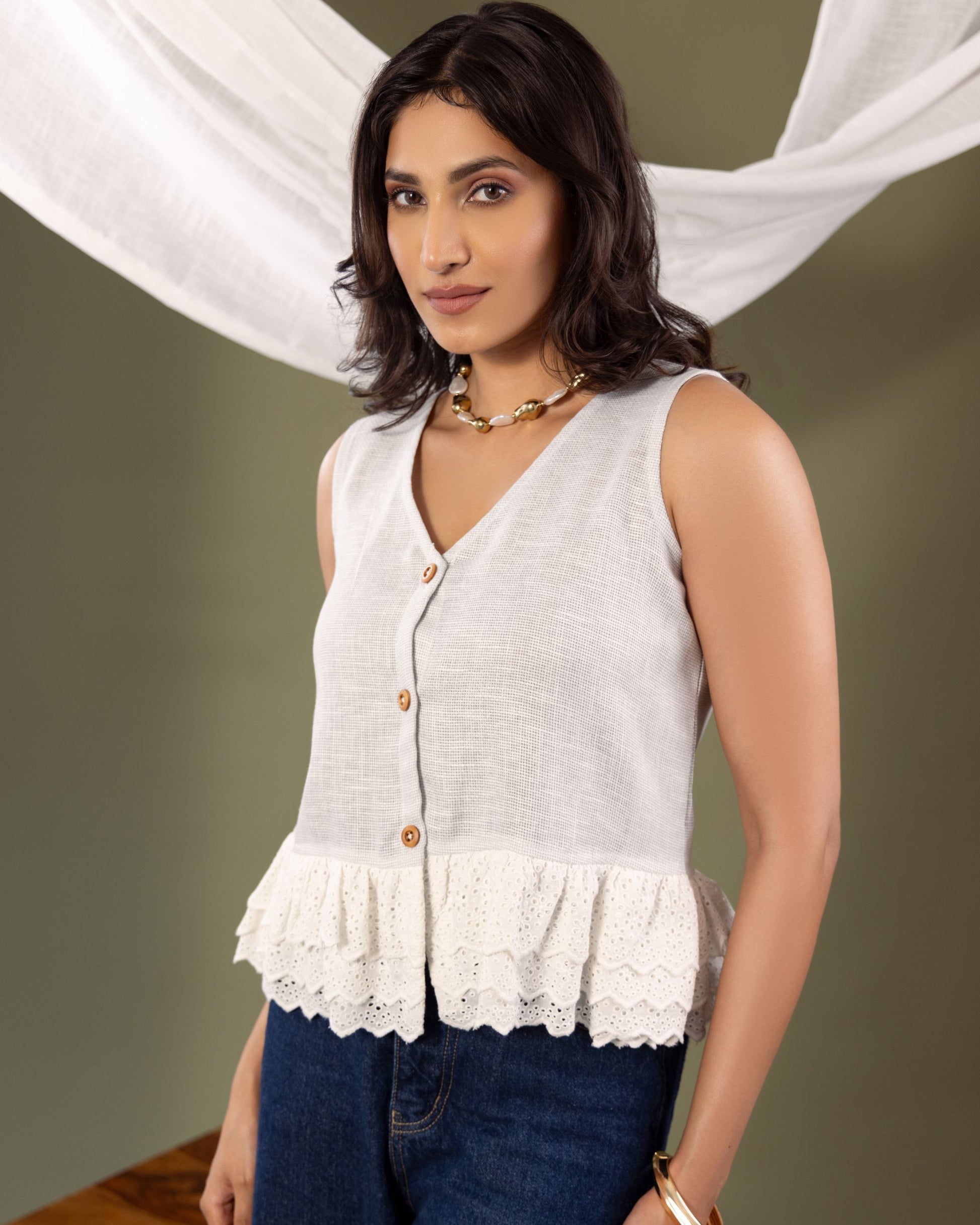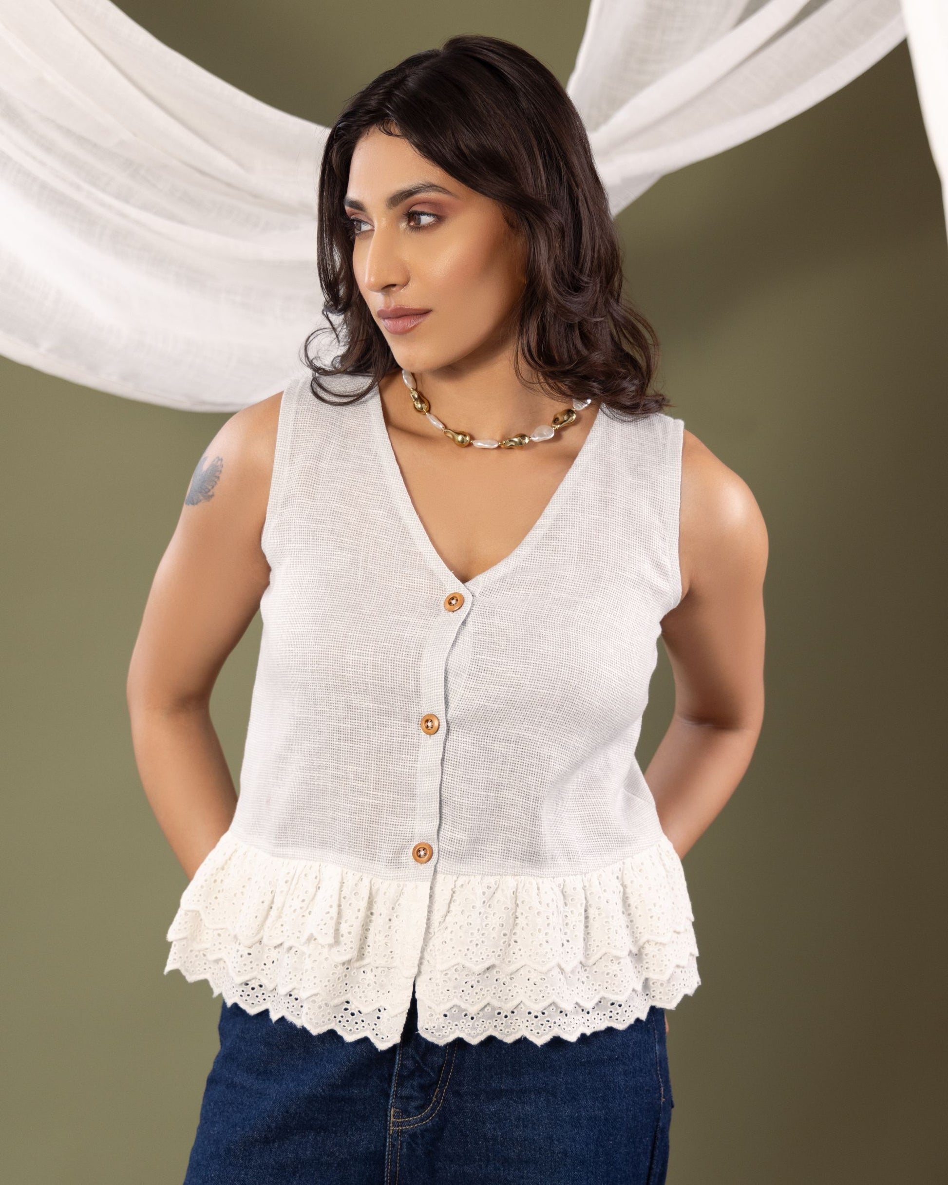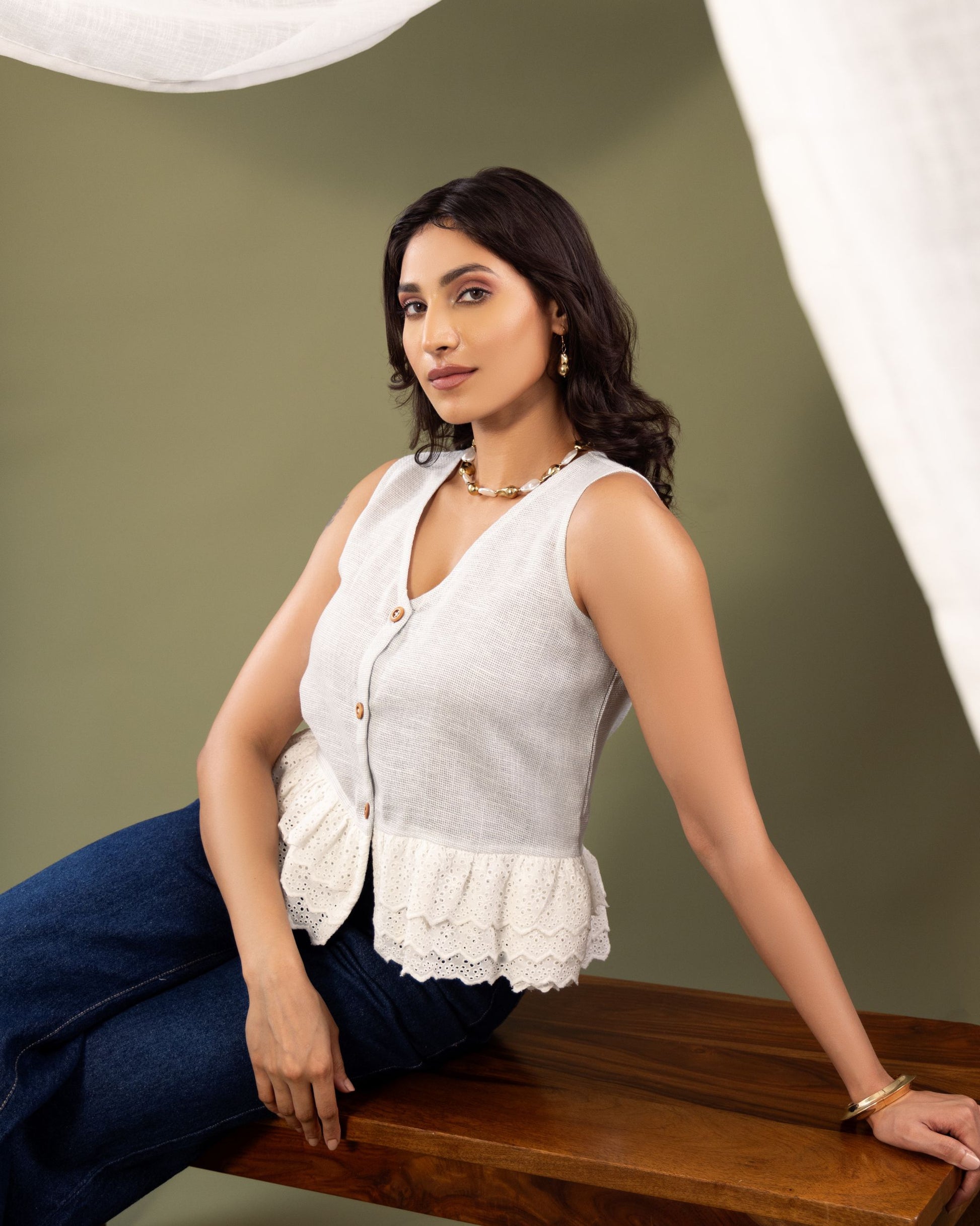 Women’s Jute Fabric Sleeveless Top with Lace Hem – Sustainable Summer Blouse by Panchakanya