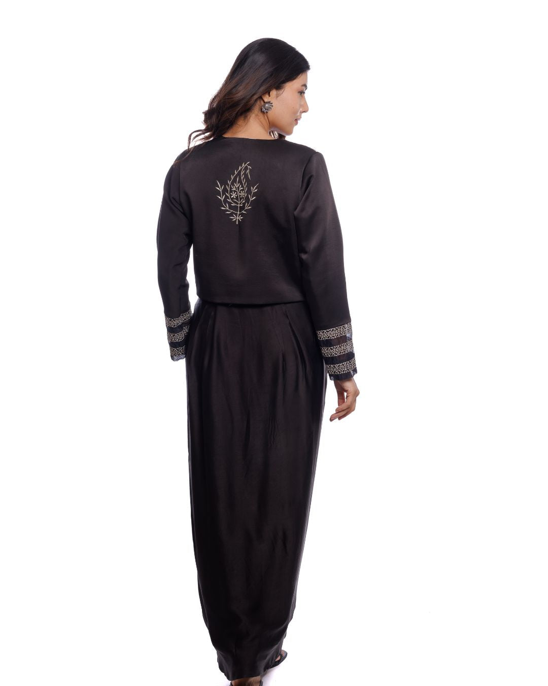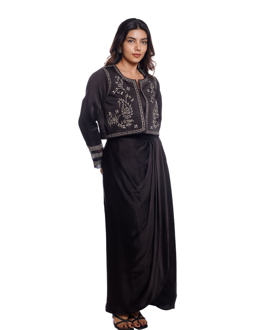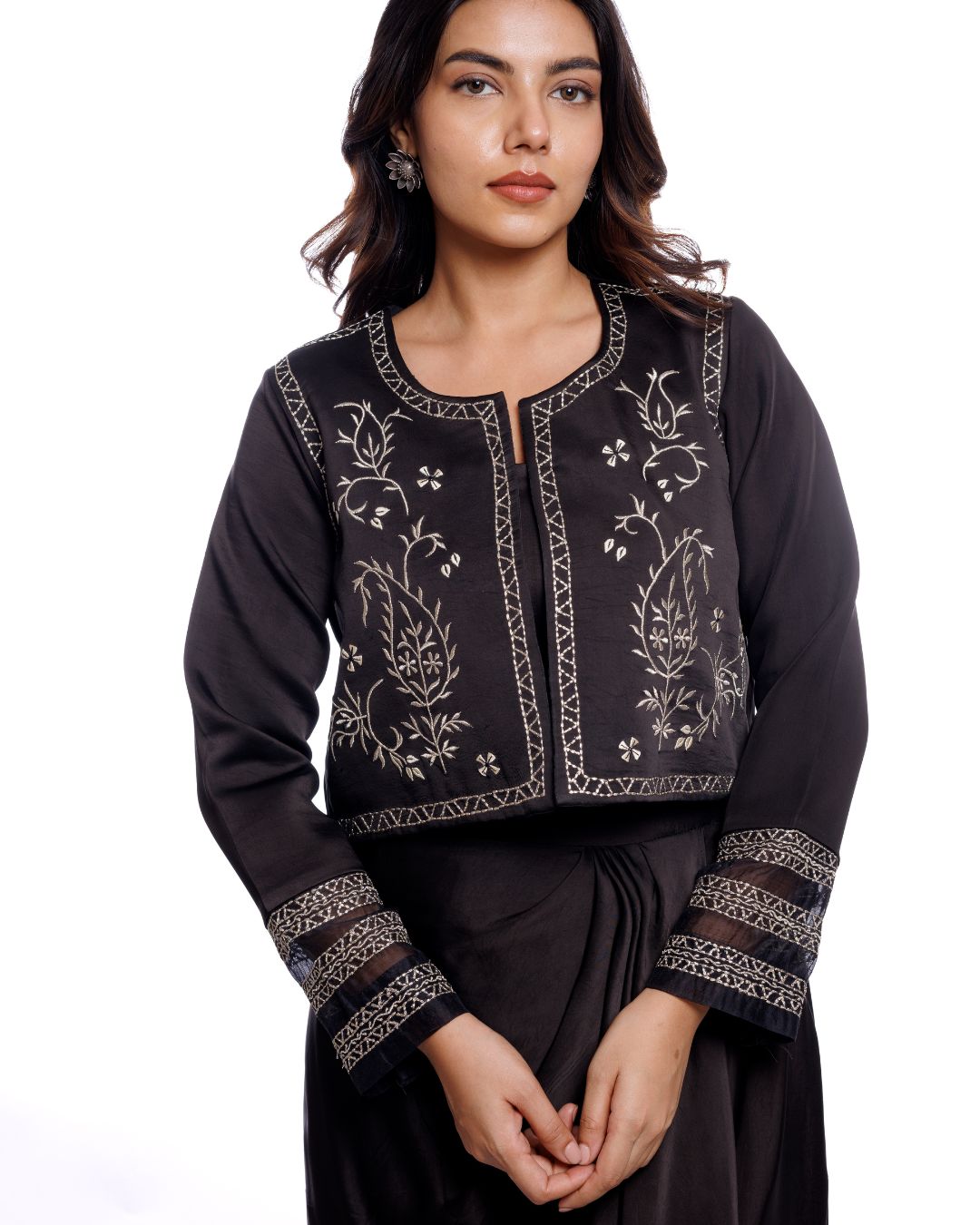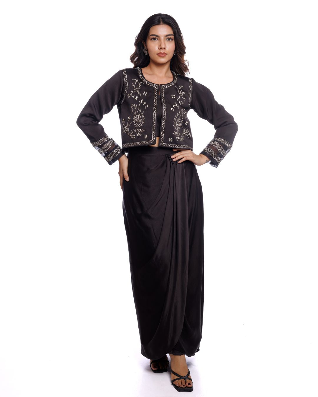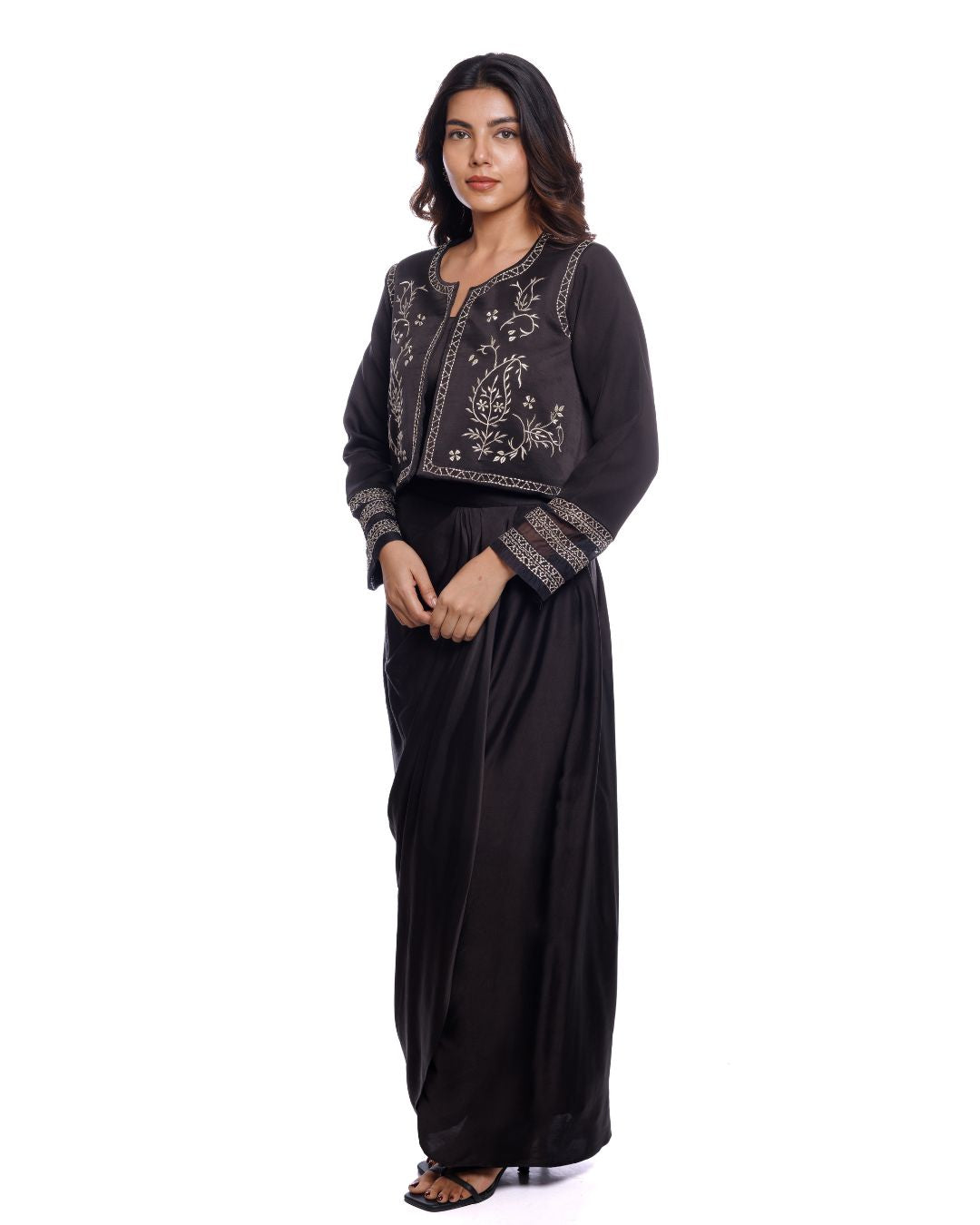 Step into the spotlight with this chic black satin 3-piece set, featuring a beautifully embroidered open-front jacket, a sleeveless blouse, and a stylish draped skirt. This ensemble blends traditional embroidery with modern silhouettes — perfect for cocktail nights, festive celebrations, or wedding receptions.