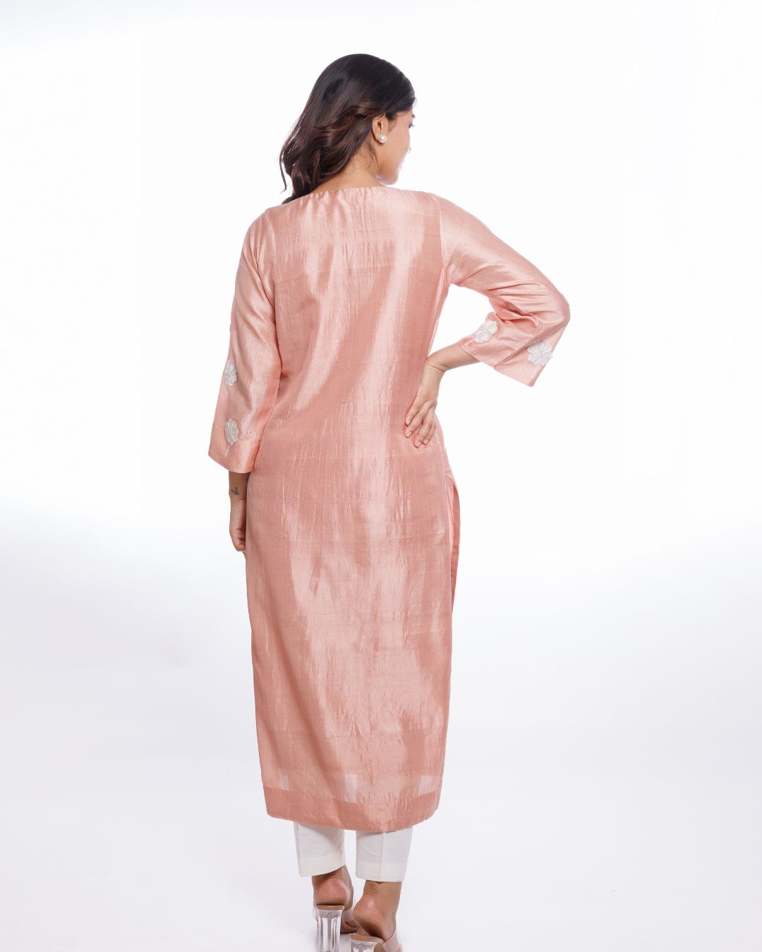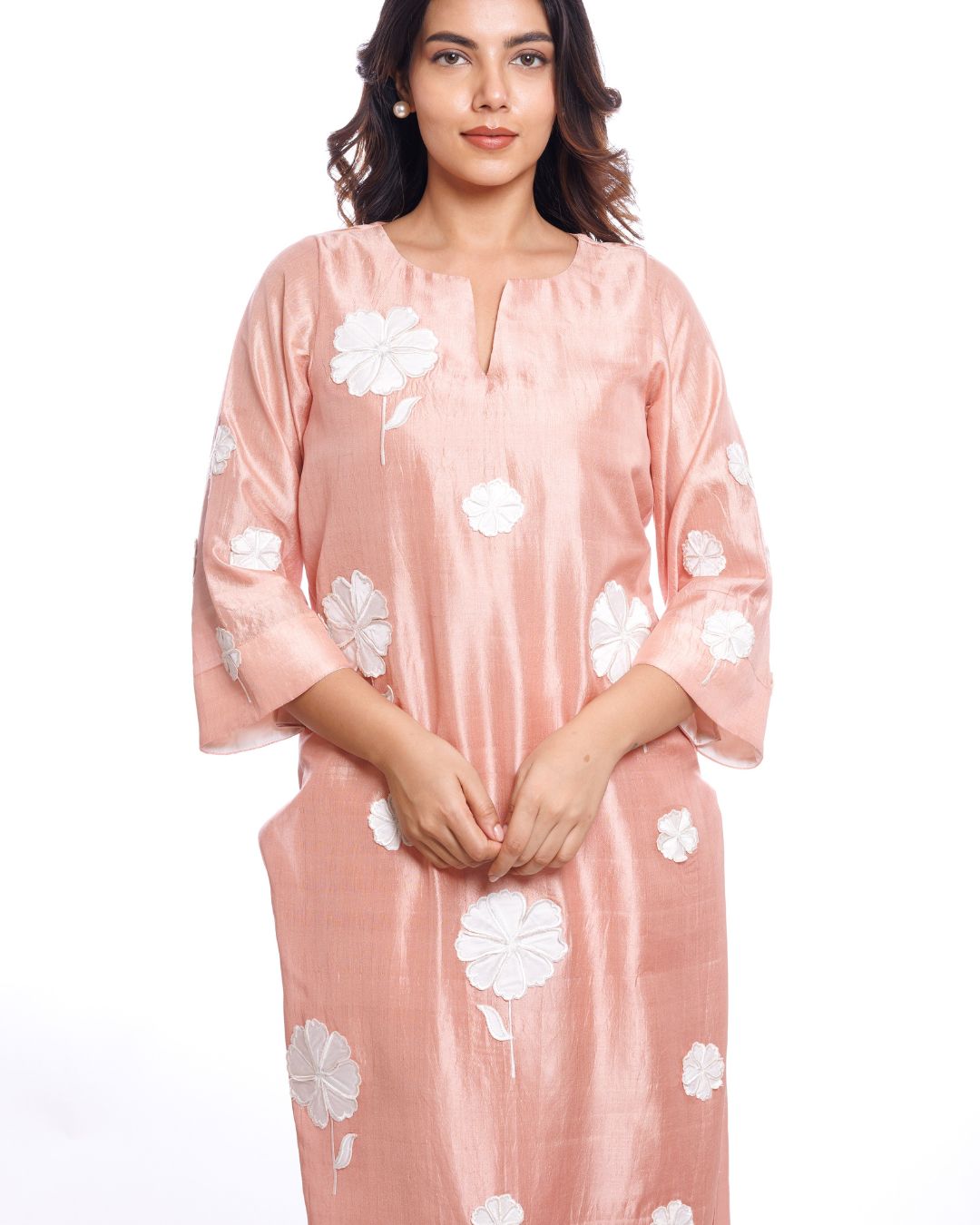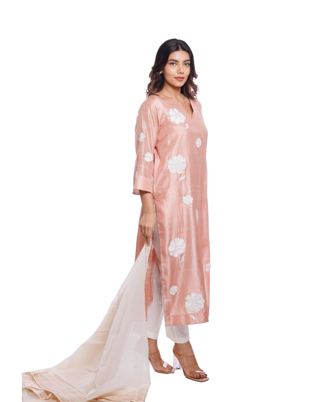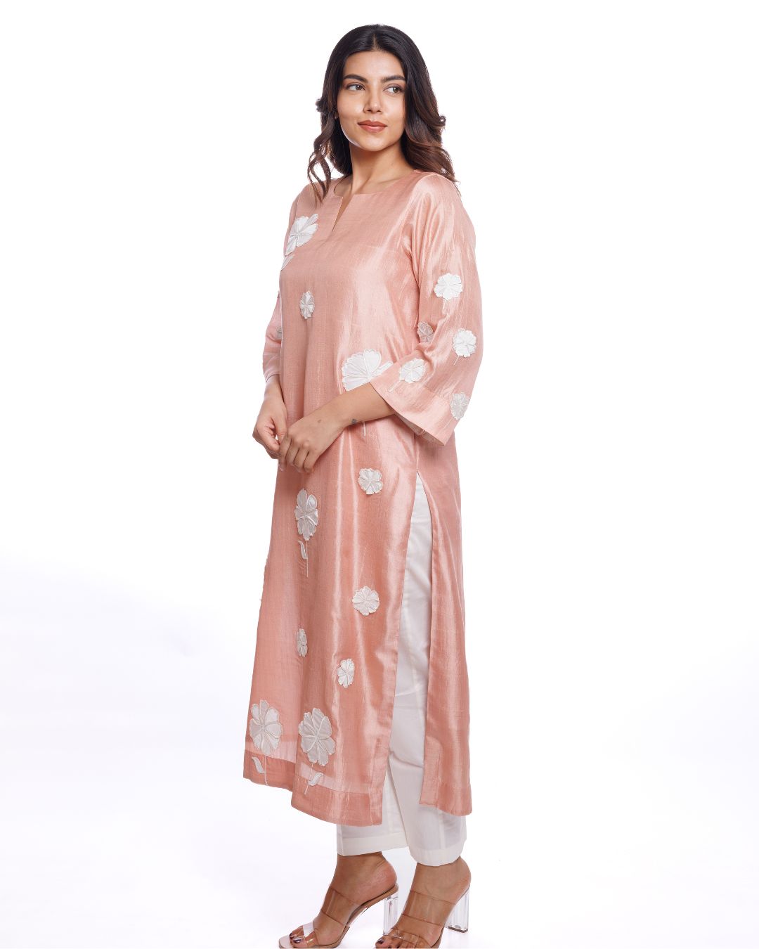 Women's Peach Mulberry Silk Kurta Pant Set with White Floral Appliqué by Panchakanya | Elegant Ethnic Wear