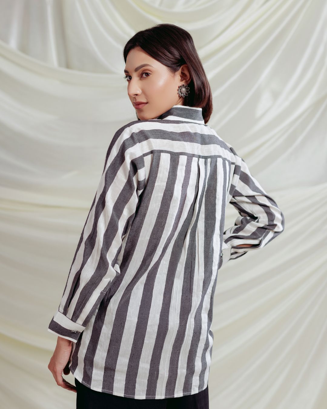 Women's Vertical Stripe Chic Linen Cotton Shirt by Panchakanya– Oversized Fit with Stylish Collar