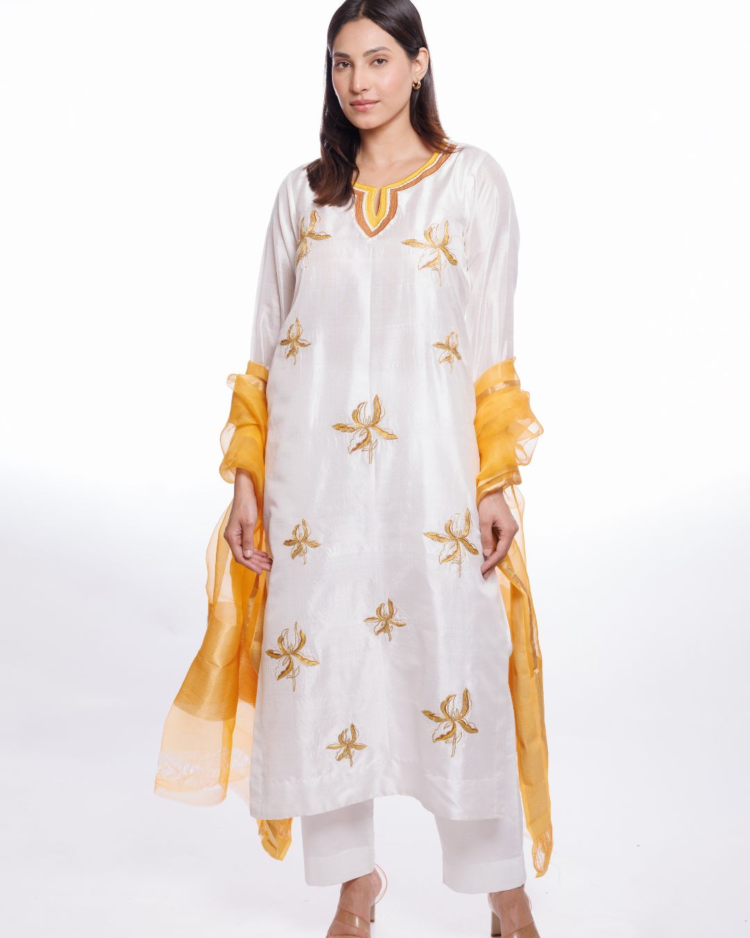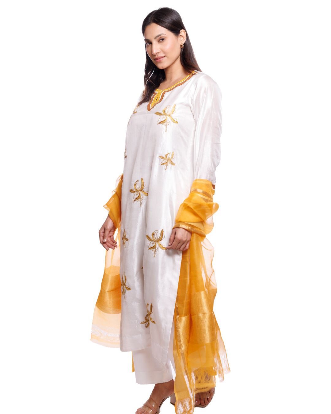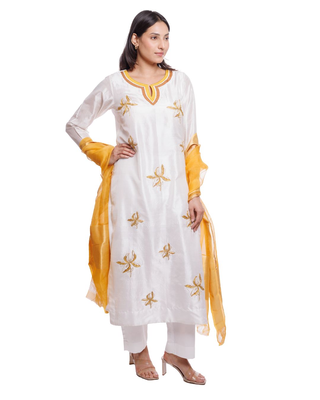 Step into timeless elegance with this White Mulberry Silk Kurta Pant Set, embellished with intricate yellow floral appliqué work. makes it a perfect pick for festive occasions, family gatherings, or intimate celebrations.