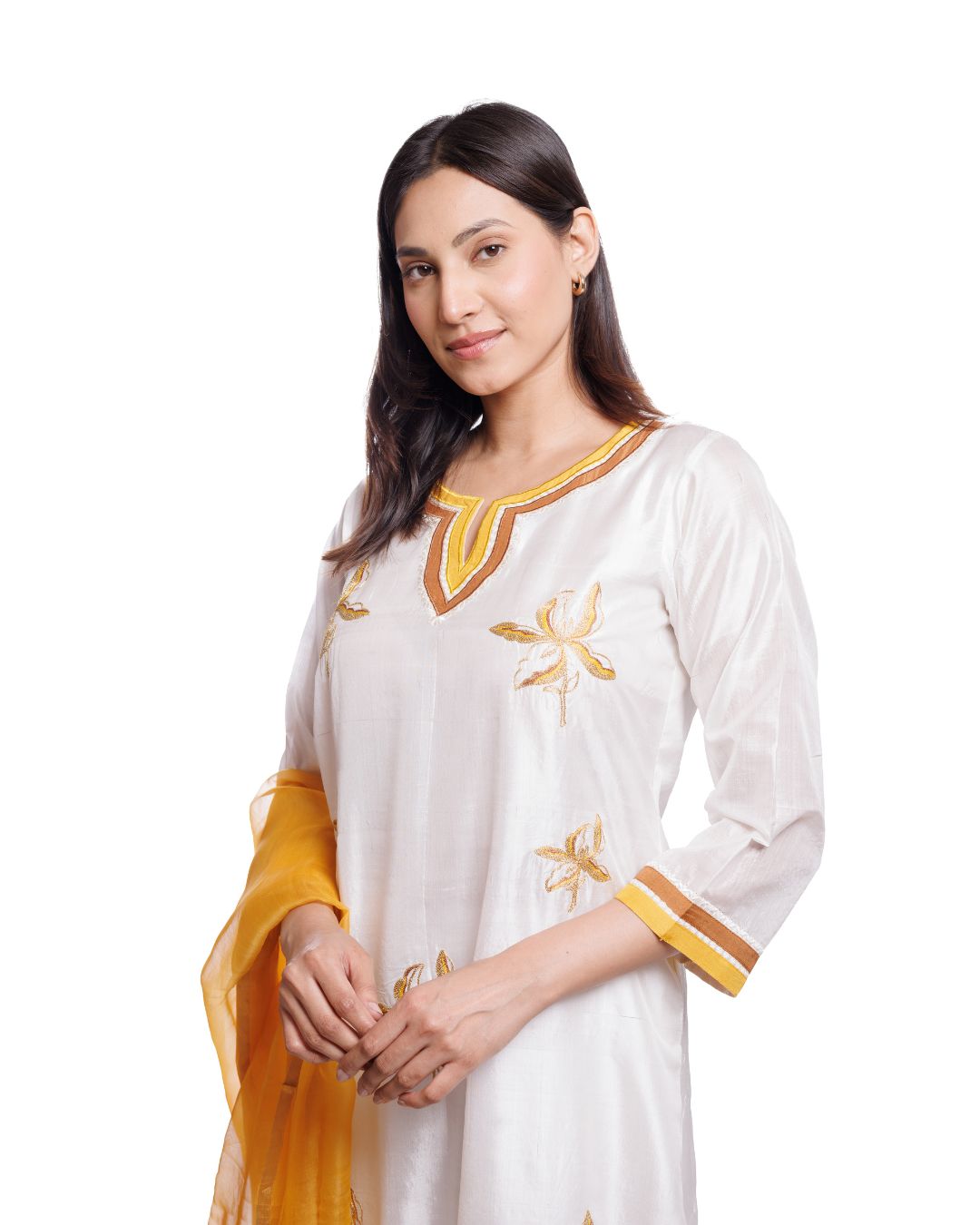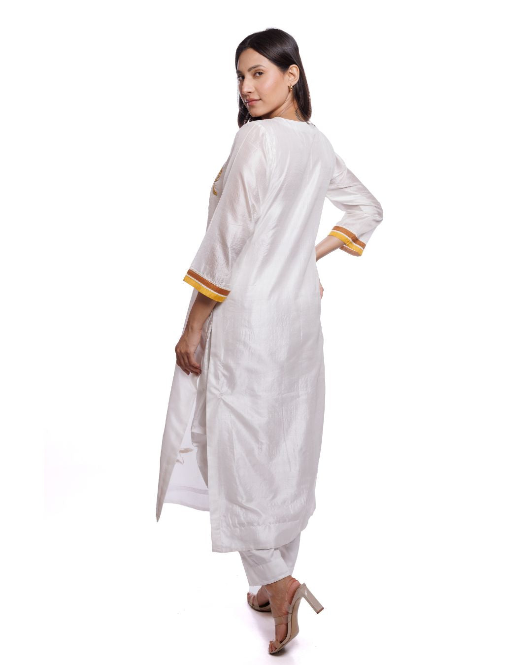 Women's White Mulberry Silk Kurta Pant Set with Yellow Appliqué Work | Festive & Ethnic Wear