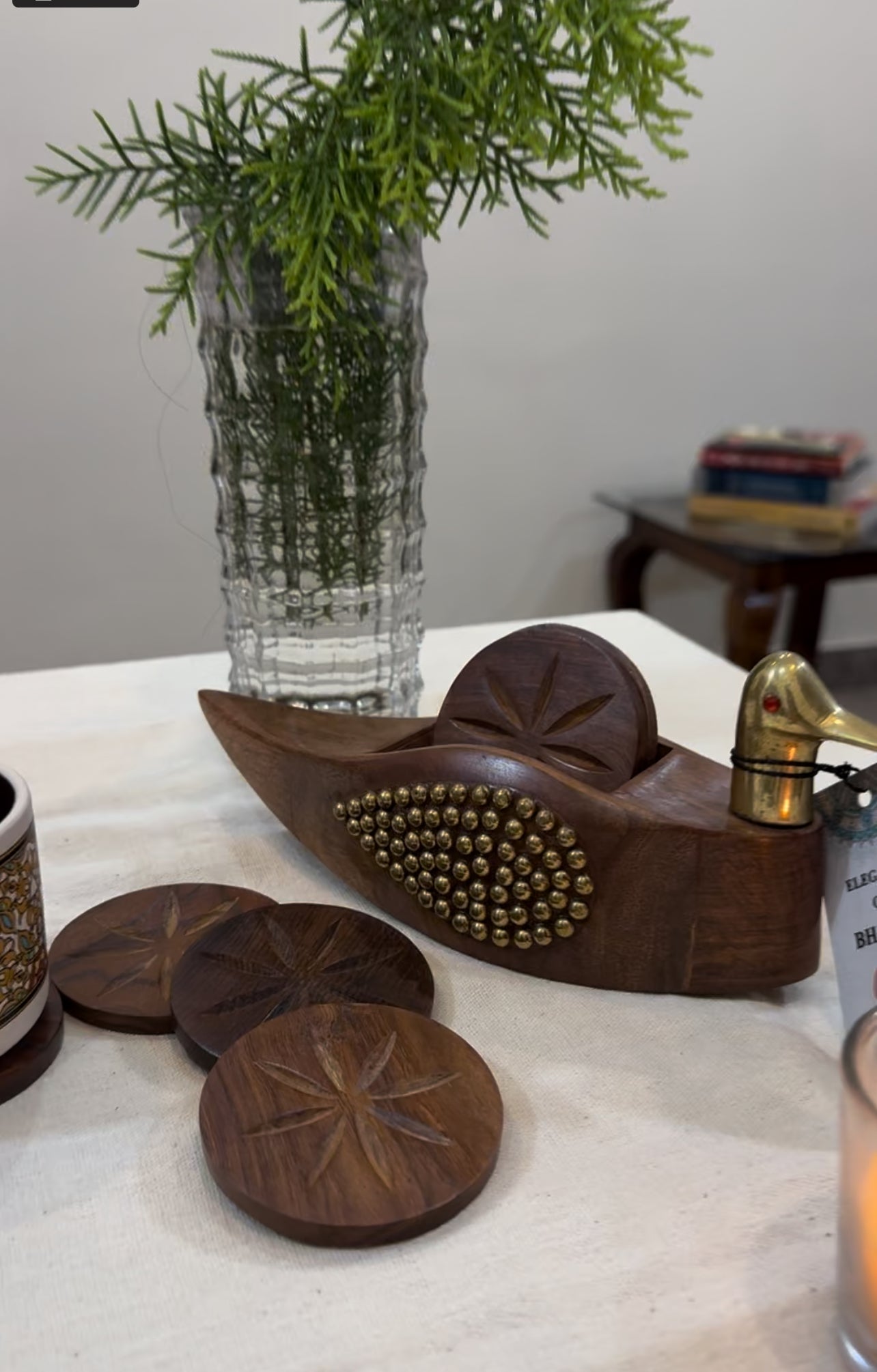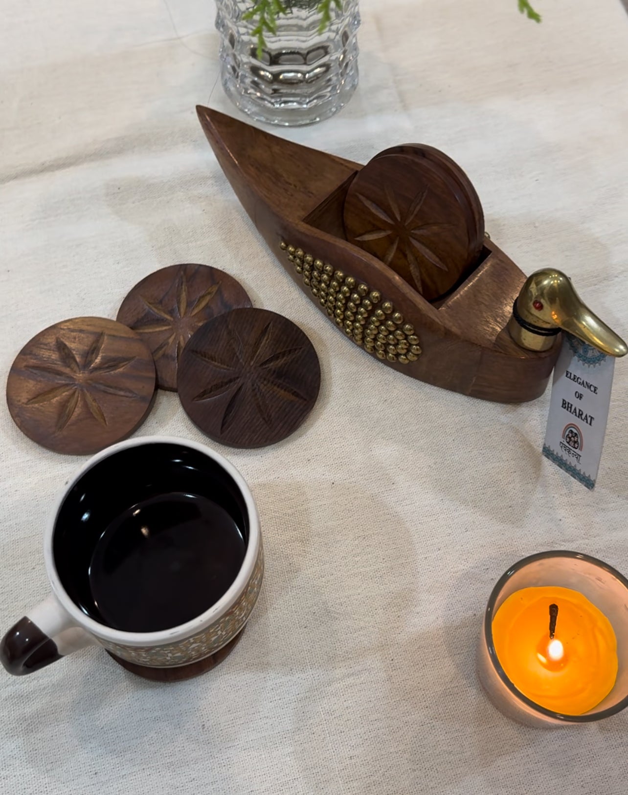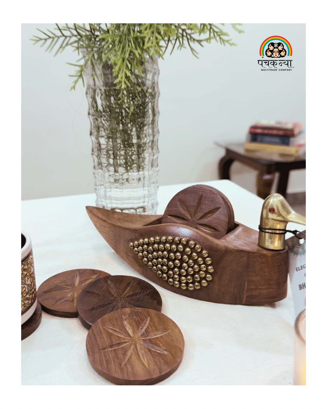 - Beautifully handmade wooden tea coasters, crafted by Indian artisans for an elegant touch to your home decor.